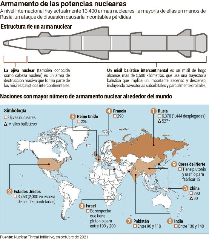 El presidente de Rusia, Vladimir Putin, puso en alerta las “fuerzas de disuasión” nuclear del ejército ruso, en el cuarto día de la invasión de Ucrania por parte de Moscú.“Ordeno al ministro de Defensa y al jefe del Estado Mayor que pongan las fuerzas de disuasión en alerta especial de combate”, dijo Putin en una reunión televisada con sus jefes militares. El ministro de Defensa, Serguéi Shoigú, respondió: “Afirmativo”.Las tensiones internacionales ya se han disparado por la invasión rusa de Ucrania y la orden de Putin ha causado aún más alarma.Moscú posee el arsenal de armas nucleares más grande del mundo y un enorme cantidad de misiles balísticos que constituyen la columna vertebral de las fuerzas de disuasión.“Ven que los países occidentales no sólo son hostiles a nuestro país en el ámbito económico, me refiero a las sanciones ilegítimas... altos funcionarios de los principales países de la OTAN también permiten declaraciones agresivas contra nuestro país”, dijo Putin.El mandatario ruso ordenó la invasión de Ucrania el pasado jueves. Desde entonces, las tropas entraron al país desde el norte, el este y el sur, pero se han enfrentado a una feroz resistencia por parte de las tropas ucranianas.Las autoridades de Ucrania aseguran que algunas tropas rusas están desmoralizadas y agotadas, y afirman que decenas de ellas se han rendido.La Unión Europa (UE) acordó, por primera vez en su historia, organizar y financiar, con 500 millones de euros, el aprovisionamiento de armas en una guerra en un país tercero, en este caso la que libra Ucrania contra el invasor ruso. “Hemos decidido utilizar nuestras capacidades para dar armas, armas letales, asistencia letal al Ejército ucraniano, por valor de 450 millones de paquete de apoyo, y 50 millones más para suministros no letales, como combustible y equipos de protección”, anunció el alto representante de la UE para Asuntos Exteriores, Josep Borrell.El acuerdo político es para utilizar la Facilidad Europea para la Paz (FEP) para financiar equipos militares en su mayoría letales, pero también no letales y material médico, en apoyo de Ucrania.Ese fondo, que empezó a funcionar en 2021 y que en siete años contará con cinco mil millones de euros, está al margen del presupuesto comunitario y se nutre de aportaciones de los Estados miembros.Los ministros también acordaron sancionar a otra veintena de oligarcas, políticos y altos directivos de empresas que apoyan el régimen del presidente ruso, Vladímir Putin, así como cerrar el espacio aéreo de la UE a los vuelos rusos.Terror y esperanzaEs el cuarto día de asedio a Kiev, los ucranianos sufren para conseguir víveres mientras continúan preparándose para repeler los ataques; mientras, en prácticamente todo el mundo se llevan a cabo marchas por la paz, antes de llegar a un conflicto nuclear a nivel internacional.SIN ARMASGobierno ucranianoUcrania renunció a su arsenal atómico en 1994 a cambio de garantías de seguridad y el reconocimiento de su soberanía. Las armas fueron entregadas a Rusia.Hasta su desmantelamiento, Ucrania era el tercer país con más armas atómicas, unas cinco mil 200.El objetivo del Tratado de No Proliferación Nuclear es lograr que la cifra llegue a cero, una veta que luce más que lejana ante las amenazas del presidente ruso.El presidente ruso dijo que había ordenado “poner las fuerzas de disuasión en alerta especial de combate”, lo que desencadenó fuertes protestas en Occidente.Sin embargo, especialistas recuerdan que una parte de los arsenales nucleares, tanto en Rusia como en la OTAN, están permanentemente listos para su uso inmediato.“Pueden activarse en 10 minutos”, dijo Marc Finaud, experto del Centro de Políticas de Seguridad de Ginebra (GCSP).“Estas son ojivas ya colocadas en misiles (en tierra o submarinos) o son bombas que ya están a bordo de los aviones de ataque”, remarcó.En un artículo publicado recientemente en el “Boletín de los Científicos Atómicos”, los expertos Hans Kristensen y Matt Korda afirmaron que más de mil ojivas nucleares están desplegadas y listas para su uso. “Dado que las fuerzas estratégicas rusas están siempre en alerta, la verdadera pregunta es si ha desplegado más submarinos o armado a los bombarderos”, enfatizó Hans Kristensen.El presidente de Ucrania, Volodímir Zelenski, no es optimista sobre que las negociaciones entre las delegaciones de Ucrania y Rusia vayan a dar resultados, pero cree que, “aunque pequeña, son una oportunidad” para la desescalada en la ofensiva que lleva a cabo Moscú contra su país.El mandatario aceptó que una delegación ucraniana mantenga conversaciones con otra rusa en la frontera ucraniano-bielorrusa “para que más tarde ni un sólo ciudadano de Ucrania tenga la menor duda de que yo, como presidente, no traté de detener la guerra, cuando había una pequeña, pero aún así una oportunidad”.“Alexandr Lukashenko (el presidente bielorruso) me pidió que las delegaciones rusa y ucraniana se encuentren en el río Prípiat. Subrayo, sin condiciones. Y lo digo francamente, como siempre, no creo mucho en el resultado de esta reunión. Pero probemos”, afirmó.Poco antes, Rusia informó de que su delegación se dirigía a la región de Gómel, cercana a la frontera ucraniana, para negociar un posible cese de las hostilidades con Ucrania, según el jefe de la delegación rusa, Vladimir Medinski, asesor del presidente Vladimir Putin. “Se está elaborando la ruta para elegir el lugar de la región de Gómel donde se garantizará la máxima seguridad para la parte ucraniana”, había dicho Medinski."Ni un sólo ciudadano de Ucrania tenga la menor duda de que yo, como presidente, no traté de detener la guerra, cuando había una pequeña, pero aún así una oportunidad".- Volodimir Zelenski, presidente de Ucrania.La orden del presidente de Rusia, Vladimir Putin, de poner en alerta las fuerzas de disuasión del