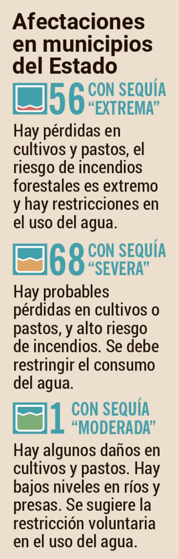 El Monitor de la Sequía en México de la Comisión Nacional del Agua indica que Jalisco es el Estado que concentra la mayor parte de municipios con sequía “extrema”. En total, 56 de los 125 municipios registran una sequía “extrema” y 68 “severa”. Solamente Puerto Vallarta está en sequía “moderada”. Jamás se habían presentado esas afectaciones en territorio jalisciense ante la falta de lluvia.A Jalisco le siguen Michoacán y Zacatecas con más daños.La investigadora del Instituto de Astronomía y Meteorología, Maydez Bárcenas Castro, explica que junio de 2023 pasará a la historia como un mes extremadamente seco. Detalló que la Región Centro (donde está el Área Metropolitana de Guadalajara), Valles, Los Altos y Sur tienen la mayor cantidad de municipios con sequía “extrema”. Agregó que se prevén más lluvias para julio; incluso, por encima de lo normal. Jesús Olmos, académico del Centro Universitario de Los Altos y experto en la producción de maíz, así como ganado lechero, acentúa que es grave la situación. “Hay un panorama preocupante porque este año no hubo lluvias en enero y prácticamente no han caído este mes. Uno de los síntomas más claros es la baja en la producción de leche: si produce una vaca 30 litros, cae a 26. Eso también incide en que, en el mediano o largo plazo, no se reproducen tanto”.Recuerda que en Los Altos de Jalisco hay más de 300 mil hectáreas en la producción de maíz. “Es una extensión grande. Y como no hay lluvias, se retrasó la siembra. Eso retrasará el nacimiento de las plantas y se reflejará en la cantidad que se produzca”. Al final, todo incidirá en los precios de los productos.La sequía “severa” que azota al país y la tercera ola de calor con temperaturas de hasta 45 grados han provocado la muerte de alrededor de 500 cabezas de ganado, aseguró la Unión Ganadera Regional de Jalisco (UGRJ).Roberto Velazco Antillón, presidente de la UGRJ, explicó que las altas temperaturas han provocado la muerte de los animales, principalmente en los municipios de Los Altos y Norte de Jalisco, entre los que se encuentran Teocaltiche, Unión de San Antonio, San Julián, Bolaños, San Martín de Bolaños, Colotlán, San Diego de Alejandría, Ojuelos, Huejuquilla, entre otros.“Si se está muriendo gente por golpes de calor, imagínense los animales. Entre la combinación de escasez de agua para el consumo de los animales y el golpe de calor han muerto algunos animales quizá en mala condición física, enfermos, desnutridos o ya viejos”.De acuerdo con el dirigente de los ganaderos, las asociaciones ganaderas locales han reportado los problemas que se tienen de agua y de muerte de animales.“Hace unos días estuvieron los coordinadores regionales de la Unión, y de los datos que nos dieron son que 500 animales que han muerto. Los productores tienen ganado cruzado de raza cebuina que aguanta más, pero metieron ganado de tipo europeo que es menos resisten al calor. En los altos me reportaron vacas grandes que también tuvieron golpes de calor”.De acuerdo con la UGRJ, cada cabeza de ganado vale entre 10 mil a 25 mil pesos, dependiendo de la raza y la edad.“Sí está empezando a ser un problema estamos hablando que se está registrando en varias ranchos y es un golpe económico para el ganadero”.RELEVANCIA NACIONALJalisco es el principal productor de carne del cerdo del país y el segundo mayor productor de carne de res. El Estado aporta más de 22% de la producción nacional de leche y 54% del huevo que se produce en México.El panorama para los productores de maíz de Jalisco es desalentador. La sequía, el desplome de los precios y el encarecimiento de los insumos agravaron el panorama para este año.Debido a que ya se reporta un mes de retraso en las lluvias, los productores de maíz de Jalisco prevén una mala cosecha.La primera siembra denominada punta de riego (antes de que inicie el temporal) son las que están en peligro de perderse porque se está yendo la humedad.“Si no lloviera o no se regara ese cultivo va a mermar la producción, la mazorca será más chica o sin granos”, indicó Pedro Barbosa, técnico y productor de maíz.De acuerdo con el productor de Jamay, Jalisco, la producción disminuirá alrededor de un 30% debido al retraso en el temporal. En Jalisco, la producción promedio por hectárea es de nueve toneladas y se espera que, para la próxima cosecha, sea de seis a siete.En materia de precios también se espera un desplome, debido a que en Sinaloa les están pagando a cinco mil pesos la tonelada, mientras que el año pasado la pagaron a ocho mil inicialmente y, al final, quedó en siete mil 400 pesos.“En el precio no hay buenos augurios, y luego con las pérdidas que habrá tan considerables, a dónde están llevando a la gente del campo”, dijo Pedro Barbosa.De acuerdo con el técnico, por cada hectárea de maíz se requiere una inversión de 30 mil pesos, cuando mínimo, por lo que en caso de que le paguen a cinco mil, apenas van a recuperar la inversión, considerando un rendimiento de seis toneladas.“En vez de ganar vas a perder porque solamente vas a sacar la inversión del costo del cultivo, pero también estas metiendo gasolina y no vas a ganar por la mano de obra”.Debido a la baja en los precios de los últimos años, muchos productos de maíz migraron a otros cultivos como el agave y los berries, pero ahora los precios también están a la baja.Añadió que el panorama se agravó para los productores luego de la desaparición de Apoyos y Servicios a la Comercialización Agropecuaria (Aserca), mediante la cual se realizaban contratos a futuro y también con la desaparición de Financiera Rural, que otorgaba créditos a los productores.El Consejo Agropecuario de Jalisco (CAJ) considera que el retraso de un mes en el arranque de las siembras por la sequía provocará una afectación a los cultivos.“El productor, en la primera lluvia seguramente va a quere