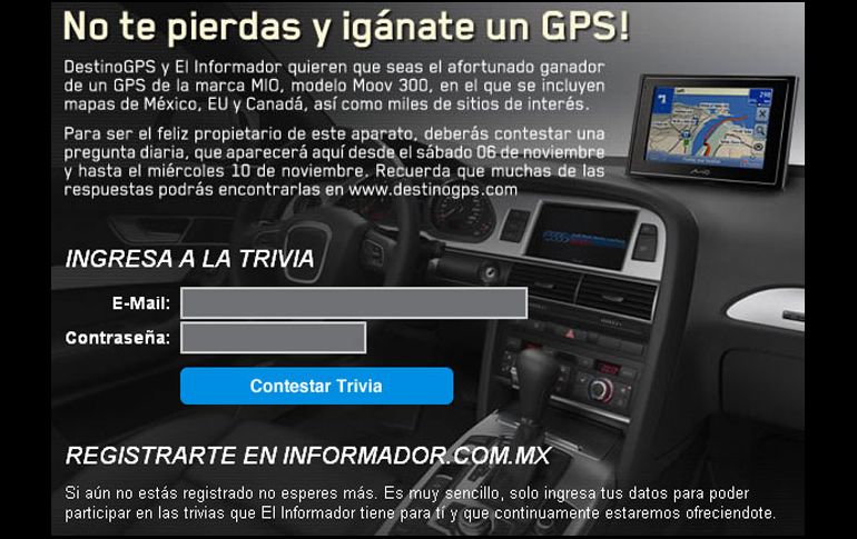 Suplementos | El ganador se hico acreedor de de un GPS de la marca MIO, modelo Moov 300 ¡Ya tenemos ganador de un GPS! El ganador se hico acreedor de de un GPS de la marca MIO, modelo Moov 300 Por: EL INFORMADOR 10 de noviembre de 2010 - 21:10 hs La trivia se publicó del 6 al 10 de noviembre el la página www.informador.com.mx. ESPECIAL / GUADALAJARA, JALISCO (10/NOV/2010).- Agradecemos a todos los que participaron en la promoción: No te pierdas y ¡gánate un GPS! El ganador de la trivia será notificado vía correo electrónico y podrá pasar a recoger su premio mañana 11 de noviembre del 2010, de 11:00 a 18:00 horas, en las instalaciones de El Informador, ubicadas en Calle Independencia 300, Centro Histórico. El ganador de la trivia es: Víctor Abdiel Garcia González Al momento de recoger su premio, deberá presentar identificación oficial (IFE), o documentos que avalen su identidad, domicilio y edad. Los invitamos a seguir al pendiente de nuestras promociones. Temas Autos GPS Lee También Pasos para tramitar permiso de instalar vidrios polarizados en tu coche Disminuye producción de autos en México Ésta es la multa por polarizar los vidrios de tu auto ¿Cuáles son errores comunes al inflar las llantas del auto? Recibe las últimas noticias en tu e-mail Todo lo que necesitas saber para comenzar tu día Registrarse implica aceptar los Términos y Condiciones