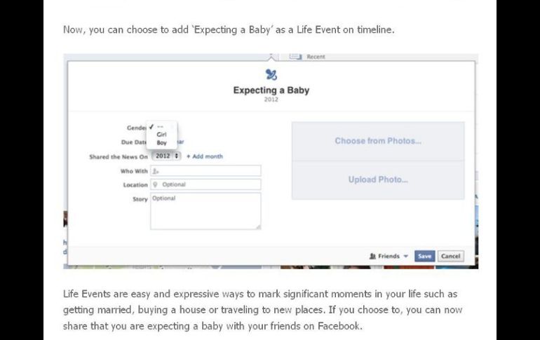 Tecnología | La red social agrega el acontecimiento de ''Esperando un bebé'' Ahora podrás presumir la llegada de un bebé en Facebook En el espacio de actualización de estados, existe una opción de agregar ''Acontecimiento importante''; la nueva opción de ''Esperando un bebé'' se sumará a las opciones ya existentes Por: EL INFORMADOR 14 de agosto de 2012 - 09:50 hs La llegada de un nuevo miembro de la familia será una de las buenas nuevas a compartir en Facebook. ESPECIAL / GUADALAJARA, JALISCO (14/AGO/2012).- Una de las noticias más importantes en la vida de una pareja es el anuncio de la llegada de su retoño. Facebook lo sabe y esta semana acaba de integrar una opción para poder presumir el estado de "Esperando un bebé", a todos los amigos. En el espacio de actualización de estados, existe una opción de agregar "Acontecimiento importante", y ahí se enlista una serie de opciones en rubros laboral, viajes, salud, y familiar tales como: Compromiso, matrimonio, nueva mascota, pérdida de un ser querido, entre otras. A partir del anuncio realizado por Facebook en su blog de noticias, la nueva opción de "Esperando un bebé" se sumará a las opciones ya existentes, y al activarla, los usuarios podrán seleccionar el sexo del nuevo miembro de la familia, así como quién es el cónyuge y la fecha contemplada para el nacimiento. De inmediato, la noticia será agregada a la línea de vida del usuario, en la fecha que sea especificada. Ahí estará identificado con un chupón y, como en las otras opciones, también se puede elegir una imagen para ilustrar el acontecimiento. La activación de esta característica estará visible para todos los contactos, en la parte donde aparecen las notificaciones de cumpleaños y eventos recientes. De manera que se identificará con un corazón y la leyenda correspondiente. Por ejemplo: "Pepe Díaz está esperando un bebé". Temas Internet Facebook Redes Sociales Recibe las últimas noticias en tu e-mail Todo lo que necesitas saber para comenzar tu día Registrarse implica aceptar los Términos y Condiciones