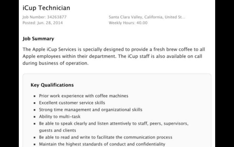 Tecnología | La empresa oferta un trabajo cuyos únicos requisitos son saber leer, escribir y servir Apple busca técnico en café El puesto es iCup Technician y las labores son: 'iClean the tablets, iServe the coffees and iCare for employees' Por: SUN 4 de julio de 2014 - 12:13 hs Entre los requisitos del trabajo incluyen la capacidad para manipular las máquinas de café y hacer las entregas. @JordanKahn. ESPECIAL / CIUDAD DE MÉXICO (04/JUL/2014).- Según el portal "Mashable", Apple acaba de lanzar una oferta de trabajo en la cual los únicos requisitos son saber leer, escribir y saber servir café. El puesto se llama iCup Technician y fue anunciado por la misma compañía el 28 de junio. En la oferta se puede leer: "Los servicios de Apple iCup han sido especialmente diseñados para proveer de café fresco a todos los empleados de Apple, en sus respectivos departamentos". Buscan un trabajador que quiera abastecer de café al resto de los empleados de la empresa. El iCup Technician, según el anuncio, tendrá las labores de "iClean the tablets, iServe the coffees and iCare for employees". La búsqueda de un técnico iCup viene después de que Apple contrató un equipo de expertos e investigadores para diseñar el software de próxima generación de Siri. Entre los requisitos del trabajo incluyen la capacidad para manipular las máquinas de café y hacer las entregas, además de que los solicitantes también deben tener algunos conocimientos de informática y estar dispuestos a aprender de forma continua. Temas Internet Apple Lee También "The Life of a Show Girl"; escúchalo en Apple Music por solo 9 pesos Revelan cómo será el primer iPhone plegable que planea lanzar Apple Internet Bienestar: Pasos para conservar tu número móvil Esto dijo Taylor Swift ante las críticas a su nuevo álbum, "The Life of a Showgirl" Recibe las últimas noticias en tu e-mail Todo lo que necesitas saber para comenzar tu día Registrarse implica aceptar los Términos y Condiciones