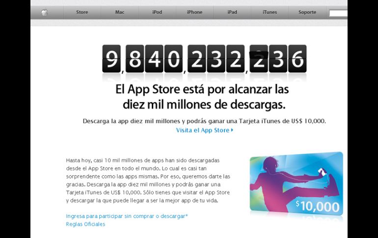 Tecnología | Regalarán una tarjeta iTunes Apple de mira a los 10 mil millones de apps Son ya casi 10 mil millones de aplicaciones que han sido descargadas desde el App Store en todo el mundo y Apple regalará una tarjeta iTunes al usuario que descargue la app número 10 mil millones Por: SUN 16 de enero de 2011 - 20:12 hs Para participar se puede descargar la aplicación que se desee. ESPECIAL / CIUDAD DE MÉXICO (16/ENE/2011).- Apple México informa que hasta hoy casi 10 mil millones de aplicaciones han sido descargadas desde el App Store en todo el mundo. Por ello, cualquier usuario que descargue la aplicación número 10 mil millones podrá ganar una tarjeta iTunes de 10 mil dólares. Para ello es necesario entrar la App Store y descargar la aplicación que se desee. Apple publica en su sitio oficial las reglas oficiales: No se requiere ninguna compra para ganar, sólo es necesario descargar cualquier aplicación pero para ganar debe ser la número 10 mil millones. 1. Elegibilidad. La Promoción de la Cuenta Regresiva de las 10 mil millones de Apps (aplicaciones) (la "Promoción") está abierta únicamente a participantes que tengan 13 años de edad o más en el momento de registrarse y que sean residentes legales de cualquiera App Store (Tienda App) participante; vea la página de inicio de App Store de su país para mayores detalles. Los participantes que sean menores de edad en su jurisdicción de residencia deben obtener la autorización de su padre, madre o tutor legal antes de participar, y con su participación manifiestan que la han obtenido. Los participantes deben registrarse en la Promoción a través de una App Store disponible en su país de residencia o a través de Apple.com. Existe una sola Promoción, y las Reglas en su país de residencia rigen su participación en la Promoción. La participación está limitada sólo a consumidores individuales; no pueden participar empresas comerciales ni otras entidades de negocios. Tampoco pueden participar los directores, ejecutivos, empleados, contratistas o agentes de Apple Inc. y sus subsidiarias, filiales, revendedores o agentes publicitarios o promocionales, ni los miembros de su familia inmediata (cónyuge, padres, hermanos e hijos). Esta promoción está sujeta a todas las leyes y reglamentos federales, estatales y locales que sean aplicables. Esta promoción es nula donde esté prohibida. La participación constituye el consentimiento pleno e incondicional del participante con estas Reglas Oficiales y las decisiones del Patrocinador, que son definitivas y vinculantes en todo asunto relacionado con la Promoción. El ganar un premio está sujeto al cumplimiento de todos los requisitos establecidos en este documento. 2. Patrocinador. El Patrocinador de esta Promoción es Apple Inc., 1 Infinite Loop, Cupertino, CA 95014 ("Patrocinador"). Toda pregunta relacionada con esta Promoción se deberá hacer mediante correo electrónico a appstoretenbillion@apple.com. 3. Duración. La Promoción comenzará el 6 de enero de 2011 y terminará con la descarga de la 10 mil millonésima app (aplicación) ("Período de la Promoción"). Para fines de la Promoción, se considerará que la descarga de la 10 mil millonésima app será la descarga de la 10 mil millonésima app desde App Store o la recepción del registro sin compra después de la descarga de la 9,999,999,999a app, lo que ocurra primero. Sólo se aceptarán los registros enviados durante este período. La computadora del Patrocinador es el dispositivo oficial de cronometraje de esta Promoción. 4. Cómo registrarse. Son dos las formas de registrarse en la Promoción: „X Usted será registrado automáticamente en la Promoción si descarga una app de App Store. „X Método sin compra: Visite www.apple.com/mx/itunes/10-billion-app-countdown/entry-form/ y llene completamente su registro en línea, incluyendo su nombre, dirección postal completa (no se aceptan apartados postales), número de teléfono y fecha de nacimiento. Una vez que complete su registro en línea, haga clic en el botón "Enviar" para que se envíe su registro. El registro con este método constituye un (1) registro para participar en la Promoción. Límite: Sin importar cuál método use para registrarse en la Promoción, sólo se otorgarán veinticinco (25) registros por persona, y/o por cuenta de iTunes o por dirección de correo electrónico, cada día. Está prohibido el uso de cualquier software automatizado de registro o lanzamiento, o de cualquier otro medio que permita al participante registrarse automáticamente en forma repetida o en exceso de las limitaciones de registro. Sólo se aceptarán los registros que se reciban durante el Período de la Promoción. El titular autorizado de la cuenta de iTunes será considerado como el participante en cuanto a los registros efectuados mediante la descarga de apps. El titular autorizado de la dirección de correo electrónico usada en el formulario en línea será considerado el participante para los registros efectuados mediante el formulario de registro en línea. Se considera como "titular autorizado de la cuenta" a la persona física a la que le haya sido asignada la dirección de correo electrónico por un proveedor de acceso a la Internet, proveedor de servicio u otra organización en línea responsable de tal asignación respecto del dominio relacionado con la dirección de correo electrónico proporcionada. Podría requerirse al posible ganador que presente pruebas de que es el titular autorizado de la cuenta o el participante. 5. Sorteo. El Patrocinador será la única organización que juzgue y cuyas decisiones relativas a la operación del Sorteo y la selección del posible ganador son definitivas y vinculantes en todos los asuntos relacionados con la Promoción. Se otorgará el premio al registro (ya sea mediante descarga de una apps o por registro en línea sin compra) enviado inmediatamente después de la descarga de la 9,999,999,999a apps. Se
