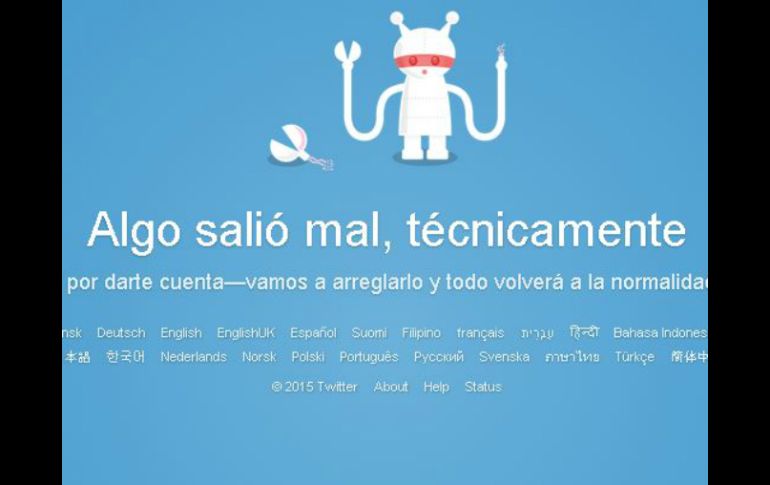 Tecnología | Algunos usuarios denunciaron que no los dejaba iniciar sesión De nuevo, Twitter presenta fallas en su servicio Algunos usuarios denunciaron que no los dejaba iniciar sesión, y que 'algo había salido mal técnicamente' Por: EL INFORMADOR 15 de enero de 2015 - 16:33 hs Es la segunda vez en lo que va del año que Twitter presenta una 'caída'. ESPECIAL / GUADALAJARA, JALISCO (15/ENE/2015).- La red social Twitter presenta una ''caída'' más en lo que va del 2015. Los tuiteros denunciaron que no los dejaba iniciar sesión, pues aparecía una pantalla azul con un robot que les decía que ''algo había salido mal técnicamente''. Al parecer, el servicio en Twitter ya se reestableció; aunque algunos usuarios señalan que es intermitente. El pasado 05 de enero, la red social también presentó una falla en el servicio a nivel mundial. En esa ocasión, el ''timeline'' de los usuarios tenía hasta una hora de desface. Temas Internet Twitter Redes Sociales Lee También WhatsApp prepara uno de los mayores cambios en su historia reciente La Granja VIP: Lolita Cortés sorprende con respuesta indiferente a la llegada de Sandra Itzel Concierto de "El Tri" se suspende un momento por caída de una pantalla (VIDEO) Lolita Cortés confiesa si volvería a criticar a Yuridia por su carrera en la actualidad Recibe las últimas noticias en tu e-mail Todo lo que necesitas saber para comenzar tu día Registrarse implica aceptar los Términos y Condiciones