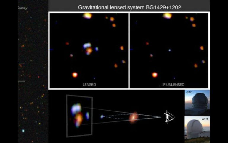 SANTA CRUZ, ESPAÑA (17/ENE/2017).- Un equipo internacional liderado por investigadores de centros de Canarias (archipiélago español en el Atlántico) ha descubierto una de las galaxias no activas más brillantes y luminosas entre las detectadas hasta la fecha en el universo joven.El Instituto de Astrofísica de Canarias (IAC) informó este martes del hallazgo de BG1429+1202, que está a 11 mil 400 millones de años luz de la Tierra, y que ha sido posible gracias a la "ayuda" de una galaxia elíptica masiva en la línea de visión de ese objeto, que actúa a modo de lente aumentando el brillo y distorsionando la imagen observada.Los resultados han sido publicados en Astrophysical Journal Letters y forman parte del proyecto BELLS GALLERY, basado en el análisis de millón y medio de espectros de galaxias del Sloan Digital Sky Survey (SDSS).Rui Marques Chaves, estudiante de doctorado del IAC-ULL (Universidad de La Laguna) y primer autor del artículo, señala en un comunicado que se trata de uno de los pocos casos conocidos de galaxias que destaca con un brillo aparente muy alto y con una luminosidad intrínseca también muy alta.Para estudiar este sistema de lente gravitatoria se utilizaron el Gran Telescopio Canarias (GTC) y el Telescopio William Herschel (WHT), ambos en el Observatorio del Roque de los Muchachos (La Palma).El sistema está formado por una galaxia elíptica masiva a una distancia de cinco mil 400 millones de años luz y una galaxia detrás de ella, BG1429+1202, emisora en la línea Lyman alfa a 11 mil 400 millones de años luz (cuando la edad del Universo era aproximadamente de 2dos mil 300 millones de años).La galaxia lente produce cuatro imágenes de la galaxia lejana, con un flujo luminoso total nueve veces superior al que tendría ésta última si no hubiera ninguna lente natural en la línea de visión.El IAC explica que lo excepcional de BG1429+1202 es su muy alta luminosidad en la línea de emisión de Lyman alfa, una de las más brillantes en el rango ultravioleta, ya que casos similares conocidos de lentes cósmicas no muestran una emisión tan intensa.