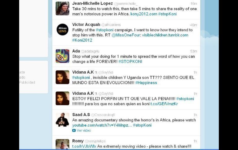 Tecnología | En Twitter se esparce su historia En las redes sociales ha surgido un impactante trend topic: #StopKoni Joseph Koni encabeza la lista de criminales de la Corte Internacional, por encima de terroristas y narcotraficantes, y aún así no han podido atraparlo Por: EL INFORMADOR 7 de marzo de 2012 - 10:50 hs GUADALAJARA, JALISCO (07/MAR/2012).- Una vez más las redes sociales unen a usuarios de todo el mundo por una sola causa #StopKoni. “Hacer famoso a Koni” es el propósito de esta campaña que pretende que todo mundo conozca a Joseph Kony para poder detenerlo. Pero ¿Quién es Joseph Koni? Es el líder del Ejército de Resistencia del Señor (ERS) y es acusado de realizar asesinatos, secuestros, violaciones y fomentar la esclavitud en Uganda. Su ejército está formado por niños a los que separa de su familia y obliga a matar y a trabajar para él. Koni tiene más de 20 años cometiendo delitos, encabeza la lista de criminales de la Corte Internacional, por encima de terroristas y narcotraficantes, y aún así no han podido atraparlo. La historia es sacada a la luz por Invisible Children, organización que agrupa a jóvenes de todo el mundo que decidieron actuar y que a lo largo de algunos años han unido fuerzas para ayudar de diferentes formas a las comunidades afectadas y que han colgado en la web el documental "Koni 2012" con la finalidad de que sea este año el último de las acciones de Koni. En lo que va de la mañana de este miércoles el tema ha logrado mantenerse entre los Trending Topics de todo el mundo con el Hash Tag #StopKoni y Uganda. También los usuarios de Facebook de han unido a este movimiento compartiendo en sus muro’s información sobre el tema o el video. Temas Internet Facebook Twitter Redes Sociales Recibe las últimas noticias en tu e-mail Todo lo que necesitas saber para comenzar tu día Registrarse implica aceptar los Términos y Condiciones