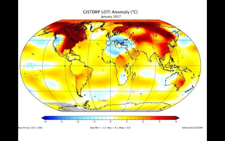 CIUDAD DE MÉXICO (15/FEB/2017).- Enero de 2017 se ubicó como el tercer mes de enero más caluroso en 137 años, desde las primeras mediciones de registros de temperatura modernos, reveló el análisis mensual de la temperatura global realizado por científicos del Instituto Goddard de Estudios Espaciales (GISS) en Nueva York. Si bien la temperatura del mes pasado fue 0.20 grados centígrados más fría que el enero más cálido observado en 2016, estuvo 0.92 grados centígrados más caluroso que la temperatura media de enero, de 1951 a 1980. Además, dos de las tres principales anomalías de la temperatura de enero han sido durante los últimos dos años. Así, 2016 fue el más caluroso registrado, con 1.12 grados centígrados por arriba de la temperatura media de enero, seguido de 2007 con 0.96 grados centígrados más cálido, con lo que enero de 2017 quedó en tercer lugar. El análisis mensual del equipo de GISS se basa en datos disponibles públicamente adquiridos por alrededor de seis mil 300 estaciones meteorológicas de todo el mundo, instrumentos y envíos basados en boyas de medición de la temperatura superficial del mar, y las estaciones de investigación Antártica. El registro de la temperatura global moderno comenzó en 1880, porque las observaciones anteriores no cubrían suficientemente el planeta.