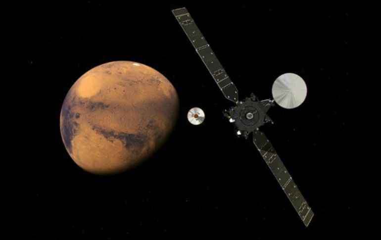 FRÁNCFORT, ALEMANIA (06/OCT/2016).- La misión ExoMars de la Agencia Espacial Europea (ESA) llegará a Marte el 19 de octubre y lanzará el módulo Schiaparelli a su superficie para realizar estudios medioambientales.La ESA informó que ExoMars entrará ese día en la órbita del Planeta Rojo y que retransmitirá las maniobras desde su centro de control de operaciones en Darmstadt, en Alemania.ExoMars es una misión conjunta entre la ESA y Roscosmos y lleva a bordo el orbitador de Gases Traza y el módulo Schiaparelli.Han viajado juntos desde el lanzamiento el pasado 14 de marzo pero el 16 de octubre se separarán, cuando se encuentren a una distancia de 900 mil kilómetros del planeta.El 19 de octubre el módulo Schiaparelli tardará seis minutos en adentrarse en la atmósfera marciana y llegar a su superficie, según la ESA.Descenderá a una región en el meridiano Planum y obtendrá, por ejemplo, los primeras mediciones del campo electromagnético en la superficie de Marte y de la concentración de polvo atmosférico.De este modo proporcionará nuevos datos sobre la importancia de las fuerzas del polvo en suspensión que pueden desencadenar tormentas de polvo.Schiaparelli demostrará tecnologías para la entrada, descenso y aterrizaje para futuras misiones y realizará un gran número de estudios medioambientales durante su corta misión en la superficie de Marte.Por su parte el orbitador de Gases Traza entrará el mismo día en una órbita elíptica de 4 días de duración alrededor de Marte. El punto más cercano al Planeta Rojo será de 300 kilómetros y el más lejano de 96.000 kilómetros.El orbitador de Gases Traza realizará un estudio detallado de los gases de Marte, prestando especial interés al metano, que en la Tierra es origen de procesos biológicos y geológicos.Una de los principales objetivos de la misión es hacer seguimiento de la detección de metano que realizó la misión de la ESA Mars Express en 2004, para comprender los procesos de generación y destrucción, con una precisión de tres órdenes de magnitud sobre las mediciones previas.El orbitador también tomará imágenes de la superficie y detectará accidentes geográficos que pueden estar relacionados en las emisiones de gases, cómo los volcanes.