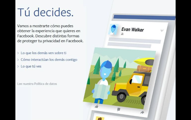Tecnología | La red social actualiza sus políticas de privacidad y las explica claramente Facebook lanza guía para explicar su política de privacidad La red social actualiza sus políticas de privacidad y las explica claramente Por: SUN 26 de noviembre de 2014 - 13:14 hs Se podrá aprender sobre cómo desetiquetarte en fotos, eliminar personas de tu lista de amigos o cómo bloquear a otros usuarios. FACEBOOK / facebook.com CIUDAD DE MÉXICO (26/NOV/2014).- Facebook actualizó sus políticas de privacidad y para explicarlas claramente esta semana lanzó una guía práctica para que los cerca de mil 350 millones de usuarios despejen sus dudas. La compañía mencionó que esto corresponde a un pedido de los miles de usuarios que piden una mayor explicación sobre el uso que hace la red social con sus datos. Los interesados pueden visitar la página de Aspectos básicos de la privacidad y aclarar sus dudas sobre gestión de datos. También se podrá aprender sobre cómo desetiquetarte en fotos, eliminar personas de tu lista de amigos o cómo bloquear a otros usuarios. La guía está disponible en 36 idiomas y se puede acceder en www.facebook.com/about/basics. La empresa también ha anunciado que actualizará sus condiciones y sus políticas de datos y cookies, para dar a conocer nuevas funciones en la red. Asimismo, los anuncios trabajarán en función de las aplicaciones y sitios que el usuario visite fuera de Facebook. Estos últimos cambios entrarán en vigencia el 01 de enero de 2015. Temas Internet Facebook Redes Sociales Aplicaciones Lee También Lolita Cortés confiesa si volvería a criticar a Yuridia por su carrera en la actualidad Spotify: mejora la calidad de sonido GRATIS de esta forma Así puedes evitar estafas con las apps de préstamos ¿Qué tipo de documentos no deberías escanear en WhatsApp para evitar fraudes? Recibe las últimas noticias en tu e-mail Todo lo que necesitas saber para comenzar tu día Registrarse implica aceptar los Términos y Condiciones