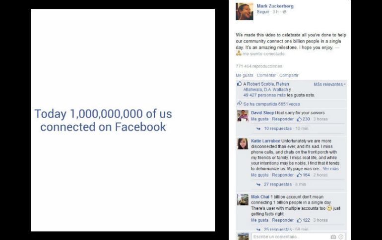Tecnología | La red social más popular del mundo alcanzó la meta el lunes pasado Facebook llega a los mil millones de usuarios La red social más popular del mundo alcanzó la meta el lunes pasado Por: EL INFORMADOR 27 de agosto de 2015 - 18:04 hs GUADALAJARA, JALISCO (27/AGO/2015).- La red social más popular del mundo llegó hoy a la meta de mil millones de usuarios activos en un solo día, informó Mark Zuckerberg, CEO de Facebook en su perfil oficial. “El lunes, una de cada siete personas en la tierra usaron Facebook para conectar con sus amigos y familia”, publicó Zuckerberg. “Cuando nosotros hablamos de nuestras finanzas, usamos números regulares, pero esto es diferente. Esta es la primera vez que alcanzamos esta meta y sólo es el comienzo de conectar a todo el mundo”. Mark se dijo orgulloso por todo el progreso logrado por la comunidad de Facebook y aseguró que la red social busca dar voz a cada persona, promover el entendimiento y la inclusión de todos en las oportunidades que brinda el mundo moderno. “Un mundo más abierto y más conectado es un mundo mejor. Trae relaciones más fuertes con las personas que amas, una economía más estable y con más oportunidades, y una sociedad más fuerte que refleja todos nuestros valores”, señaló. “Gracias por ser parte de nuestra comunidad y por todo lo que han hecho para ayudarnos a alanzar esta meta. Espero con ansias ver qué más podemos alcanzar”. La noticia fue celebrada por los usuarios de la red social quienes compartieron sus experiencias con Facebook en la publicación de Zuckerberg. Como Kenneth Alasdair, quien contó como a través de la plataforma pudo encontrar a un grupo de apoyo para gemelos que ayudó a superar la muerte de su hermano. Susan Chesney afirmó que mediante Facebook pudo comunicarse con su familia para hacerles saber que estaba bien tras el terremoto que sacudió Japón en el 2011. Facebook fue lanzado en el 2004 como una red social sólo para estudiantes de Harvard cuando Mark Zuckerberg era estudiante. En el 2006, la plataforma fue abierta para toda persona con una dirección de correo electrónico. Temas Internet Facebook Redes Sociales Mark Zuckerberg Lee También Continúa la entrega de tarjetas Yo Jalisco Apoyo para el Transporte este 9 de octubre Se filtran nuevos ADIDAS diseñados por Bad Bunny (FOTOS) Beca Benito Juárez: ¿Cuál es el último día para realizar el registro? Plataforma de Hulu llegará a México; esto se sabe Recibe las últimas noticias en tu e-mail Todo lo que necesitas saber para comenzar tu día Registrarse implica aceptar los Términos y Condiciones