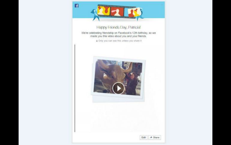 Tecnología | Regala a sus usuarios la opción de un video con imágenes de sus amigos Facebook obsequia video a usuarios por el Día de la amistad Regala a sus usuarios la opción de un video con imágenes de sus amigos Por: AP 4 de febrero de 2016 - 07:09 hs Cada usuario podrá borrar o añadir algunas imágenes que aparecen en el material. FACEBOOK / Especial. SAN FRANCISCO, ESTADOS UNIDOS (04/FEB/2016).- Facebook obsequiará a sus mil 600 millones de usuarios con collages compuestos por las imágenes de sus amistades para celebrar el 12 aniversario de la red social. Los collages se presentarán en un video formado por fotos de amigos y familiares que ya hayan sido publicadas en Facebook. La selección del contenido se realiza de forma automatizada, aunque cada usuario podrá borrar o añadir algunas imágenes. Los videos serán privados a no ser que el usuario decida compartirlos en su perfil. La mayoría de los usuarios de la red social debería empezar a ver los collages en la parte alta de su muro a mediodía del jueves, calificado por la empresa de Menlo Park, California, como el "Día de los Amigos". Coincide con el aniversario 12 desde que el director ejecutivo Mark Zuckerberg pusiera en marcha Facebook en su residencia en la Universidad de Harvard. Temas Internet Facebook Día del amor y la amistad Redes Sociales Lee También Sergio Mayer Mori provoca "suspensión" de transmisiones en "La Granja VIP" por descuido Vive el otoño entre las calles de Guadalajara Restaurante "El Atracadero" reaparece en Veracruz tras viajar 300 km (VIDEO) Lugares más terroríficos de Guadalajara según la IA Recibe las últimas noticias en tu e-mail Todo lo que necesitas saber para comenzar tu día Registrarse implica aceptar los Términos y Condiciones