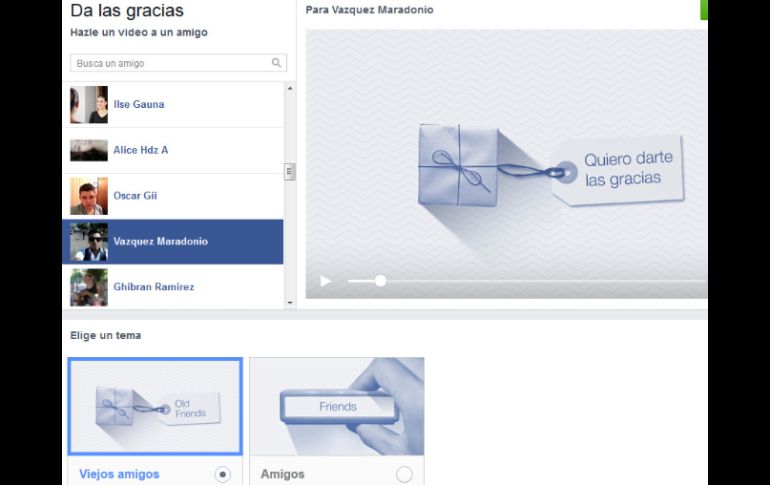 Tecnología | La nueva herramienta llamada 'Say Thanks' se da con motivo del Día de Acción de Gracias Facebook permitirá a usuarios crear videos de agradecimiento La nueva herramienta llamada 'Say Thanks' se da con motivo del Día de Acción de Gracias Por: EL INFORMADOR 13 de noviembre de 2014 - 11:02 hs Se elige al contacto al cual se le quiere 'agradecer' y de manera automática, se despliegan las fotografías del usuario con este. ESPECIAL / Facebook GUADALAJARA, JALISCO (13/NOV/2014).- La red social, Facebook, ha lanzado una nueva herramienta llamada "Say Thanks" o "Di Gracias", la cual, permite a sus usuarios crear un video de agradecimiento para alguno de sus contactos, esto con motivo del Día de Acción de Gracias. Para realizar un video, se debe ingresar al link facebook.com/thanks en donde se puede elegir entre dos temas especialmente diseñados, los cuales contienen música pre cargada y permiten seleccionar una serie de fotografías desde los álbumes de Facebook. Se elige al contacto al cual se le quiere "agradecer" y de manera automática, se despliegan las fotografías del usuario con este, para hacer más sencilla la producción. Una vez completado el clip, se tiene la opción de compartir directamente en el muro de la persona para que todos lo vean, o únicamente con él, las opciones de privacidad pueden ser modificadas por los usuarios. PARA SABER El día de acción de gracias, motivo por el cuál fue creada la aplicación, se celebra en Estados Unidos, el cuarto jueves del mes de noviembre. Ese año será el día 27. EL INFORMADOR/ PATRICIA GALLARDO Temas Internet Facebook Día de acción de gracias Redes Sociales Aplicaciones Lee También Así puedes usar el cempasúchil para repeler insectos Halloween y Día de Muertos en Guadalajara: las mejores actividades en la ciudad Revive con la flor de muertos: beneficios del té de cempasúchil Lolita Cortés confiesa si volvería a criticar a Yuridia por su carrera en la actualidad Recibe las últimas noticias en tu e-mail Todo lo que necesitas saber para comenzar tu día Registrarse implica aceptar los Términos y Condiciones