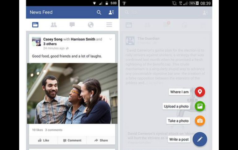 Tecnología | Pretenden que desarrolladores modifiquen sus apps con un estilo más simple Facebook se adapta a Material Design de Google Pretenden que desarrolladores modifiquen sus apps con un estilo más simple Por: SUN 13 de febrero de 2015 - 12:53 hs Por el momento, estos son algunos de los cambios que se pueden ver. TWITTER / @PhoneDog CIUDAD DE MÉXICO (13/FEB/2015).- La compañía tecnológica Google ha modificado la apariencia de las aplicaciones para su nuevo estilo de diseño Material Design de Android 5.0 Lollipop. Como se menciona en el portal The Next Web, aunque aún no se han adaptado todas, la firma pretende que los desarrolladores modifiquen sus apps para acoplarse con este estilo más simple y plano. Por el momento, algunos cambios se pueden ver en la aplicación de Facebook, que ya está probando su nuevo diseño adaptado a Material Design. Dado que la red social es utilizada por millones de usuarios desde sus teléfonos inteligentes, los desarrolladores modifican constantemente la app para las diferentes plataformas, sobre todo para el sistema operativo Android que cuenta con la mayor cuota de mercado a nivel global. Recientemente Facebook lanzó una versión más ligera llamada Lite, para mercados emergentes con problemas de conectividad. Temas Internet Google Facebook Android Aplicaciones Recibe las últimas noticias en tu e-mail Todo lo que necesitas saber para comenzar tu día Registrarse implica aceptar los Términos y Condiciones