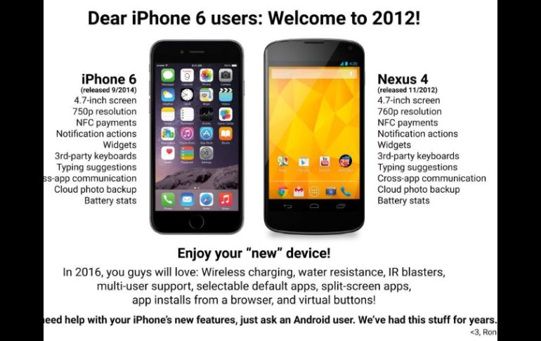 Tecnología | El iPhone 6 ha sido blanco de críticas por parte de los usuarios en redes sociales Fans de Android se burlan de Apple El nuevo iPhone 6 ha sido blanco de críticas por parte de los usuarios en redes sociales Por: SUN 11 de septiembre de 2014 - 11:23 hs Esta imagen se ha vuelto viral en redes sociales. ESPECIAL @RonAmadeo / CIUDAD DE MÉXICO (11/SEP/2014).- Desde su salida esta semana, el nuevo iPhone 6 ha sido blanco de críticas por parte de los usuarios de Android, dada la aparición de un gráfico que compara el equipo con uno de hace dos años. Ron Amadeo, editor del reconocido sitio estadounidense de tecnología Ars Technica, lo compartió en un tuit titulado: "Queridos usuarios de iPhone 6, bienvenidos a 2012". En él comparó algunas de las nuevas especificaciones incorporadas en el iPhone 6 con las funciones de otro móvil, el Nexus 4. Esta imagen se ha vuelto viral entre los seguidores de Android y del móvil de Google, ya que éste fue lanzado hace dos años. En la imagen se destacan características similares entre los equipos. Ambos móviles cuentan con particularidades como la conexión NFC, los pagos móviles, teclados diseñados por terceros, widgets y estadísticas de uso de batería, elementos que Apple subrayó como nuevos en la presentación del iPhone 6 y 6 Plus. Sin embargo, cabe señalar que el Nexus 4 no cuenta con funciones como el sensor dactilar Touch ID, el procesador de arquitectura de 64bits, la grabación a cámara lenta de 240 cuadros por segundos o la capacidad de almacenamiento de 128GB. Se menciona que será hasta 2016 que los usuarios de iPhone podrán disfrutar de un móvil resistente al agua, multiusuario o con carga inalámbrica. En el post que acompaña a la imagen se puede leer un mensaje de Amadeo, en el que motiva a los usuarios de Apple a preguntar a uno de Android por el funcionamiento de su nuevo equipo: "Si usted necesita ayuda con las nuevas funciones de su iPhone sólo pregunte a un usuario de Android. Nosotros las hemos tenido desde hace años". Temas Gadgets iPhone Apple Smartphones Redes Sociales Android Lee También La generación ansiosa Continúa la entrega de tarjetas Yo Jalisco Apoyo para el Transporte este 9 de octubre Se filtran nuevos ADIDAS diseñados por Bad Bunny (FOTOS) Beca Benito Juárez: ¿Cuál es el último día para realizar el registro? Recibe las últimas noticias en tu e-mail Todo lo que necesitas saber para comenzar tu día Registrarse implica aceptar los Términos y Condiciones
