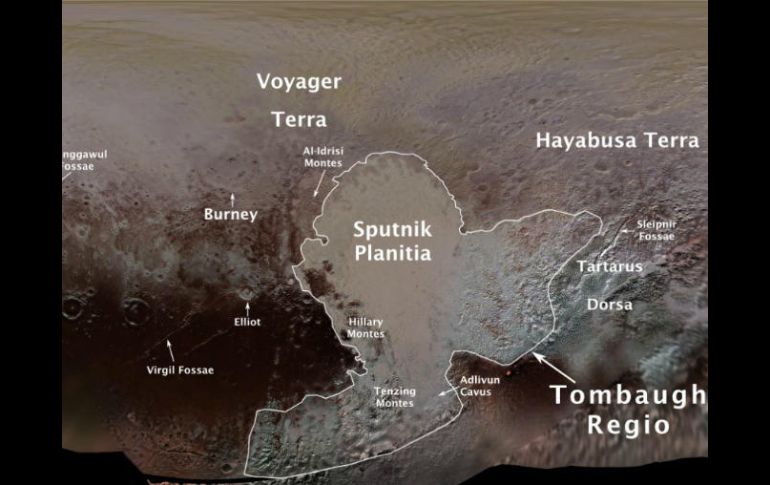 CIUDAD DE MÉXICO (07/SEP/2017).- La Unión Astronómica Internacional (IAU, por sus siglas en inglés) oficializó un total de 14 nombres para cada planicie, elevación o accidente geográfico, en la superficie de Plutón. Los nombres aprobados rinden homenaje a la mitología del mundo subterráneo, misiones espaciales pioneras en la exploración y científicos e ingenieros ligados a Plutón y el Cinturón de Kuiper, destacó la Administración Nacional de la Aeronáutica y del Espacio (NASA, por sus siglas en inglés). Tombaugh será el nombre de la zona con forma de corazón en el sur de Plutón, en honor a su descubridor, el astrónomo estadounidense Clyde Tombaugh. Un cráter llevará el nombre de Venetia Burney, estudiante de 11 años de edad que en 1930 sugirió el nombre de "Plutón", dios romano del inframundo, "Apreciamos la contribución del público en general en la forma de sus sugerencias y el equipo de New Horizons por proponernos estos nombres", dijo la presidenta del Grupo de Trabajo de la IAU para Nomenclatura de Sistemas Planetarios, Rita Schulz. De acuerdo con la agencia espacial estadounidense, el grupo encargado de asignar los nombres siguió la sugerencia original de Venetia Burney, pues varios de los lugares en Plutón provienen de la mitología del mundo subterráneo. Tombaugh, astrónomo que descubrió Plutón en 1930, del observatorio de Lowell en Arizona. Cráter de Burney honra a Venetia Burney (1918-2009), quien como una estudiante de 11 años de edad, sugirió el nombre de "Plutón". Sputnik Planitia, por el primer satélite espacial lanzado por la Unión Soviética en 1957. Tenzing Montes y Hillary Montes, cordilleras que honran a los primeros en llegar a la cumbre del Monte Everest y regresar a salvo. Al-Idrisi Montes, por el geógrafo árabe Ash-Sharif al-Idrisi. Djanggawul Fossae, red de depresiones largas y estrechas, los Djanggawuls son tres seres de la mitología indígena australiana. Sleipnir Fossa, nombre del poderoso caballo de ocho patas de la mitología nórdica que llevó al dios Odín al inframundo. Virgil Fossae, en honor a Virgilio, poeta romano y guía ficticia de Dante en el infierno y purgatorio en la Divina Comedia. Adlivun Cavus, profunda depresión llamada Adlivun, inframundo en la mitología inuit. Hayabusa Terra, gran masa terrestre que recibe el nombre por la nave espacial japonesa la cual realizó el primer retorno con muestras de asteroides. Voyager Terra, por las naves espaciales Voyager 1 y 2. Tártaro Dorsa, una cresta, llamada así por el más profundo y oscuro pozo del inframundo en la mitología griega, Tártaro. Cráter Elliot, reconoce a James Elliot, investigador pionero en el uso de ocultaciones estelares para estudiar el sistema solar.