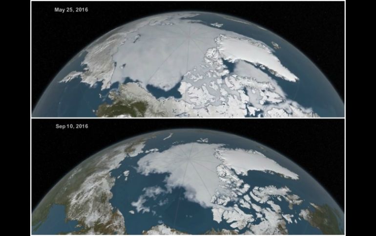 WASHINGTON, ESTADOS UNIDOS (15/SEP/2016).- El hielo del Océano Ártico este verano disminuyó a su segundo menor nivel desde que los científicos comenzaron a monitorearlo vía satélite.El hielo en el mar alcanzó su punto más bajo en verano el sábado, extendiéndose 4.14 millones de kilómetros cuadrados (1.6 millones de millas cuadradas), indicó el Centro Nacional de Datos de Nieve y Hielo en Colorado. Eso está detrás solamente de los 3.39 millones de kilómetros cuadrados (1.31 millones de millas cuadradas) registrados en 2012.El nivel de este año técnicamente fue de 9.842 kilómetros cuadrados (3.800 millas cuadradas) menos que en 2007, pero eso es tan cercano que los dos años prácticamente están empatados, dijo Mark Serreze, director del centro.El nivel mínimo del 2016 año es de casi 2.59 millones de kilómetros cuadrados (un millón de millas cuadradas) menor que el promedio registrado desde 1979 al año 2000, lo cual equivale al tamaño de Alaska y Texas combinadas.Los científicos culpan de estos cambios al cambio climático generado por el hombre.