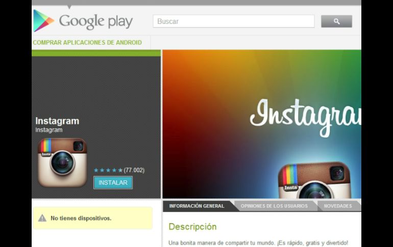 Tecnología | La aplicación permite aplicar filtros sobre fotografías tomadas con un smartphone Instagram para Android acumula más de un millón de descargas A sólo 24 horas, la aplicación de la empresa fundada por Kevin Systrom y Krieger Mike llegó al millón de descargas Por: NTX 4 de abril de 2012 - 19:00 hs La App para el sistema operativo de Google ofrece una experiencia familiar. ESPECIAL / CIUDAD DE MÉXICO (04/ABR/2012).- A tan sólo 24 horas de haberse liberado para dispositivos Android, la aplicación de edición de fotos Instagram acumuló más de un millón de descargas en el mercado Google Play. La empresa fundada por Kevin Systrom y Krieger Mike lazó por primera vez esta aplicación (App) en 2010, exclusiva para teléfonos Iphone con sistema operativo IOS, y hasta la fecha ha logrado más de 30 millones de usuarios en el mundo. La aplicación permite aplicar filtros sobre fotografías tomadas con el smartphone, para darles impresiones antiguas, en blanco y negro, sepia o resaltar colores, entre otros; además de poderla compartir directamente en las redes sociales Facebook o Twitter. "Hemos estado trabajando incansablemente para hacer de esta nueva aplicación para Android una de primera clase. Hemos sido meticulosos sobre la traducción de la experiencia de Instagram a la plataforma" señaló la compañía en su sitio web. Además, precisó que la App para el sistema operativo de Google ofrece una experiencia familiar y todos los filtros disponibles para iPhone. Temas Gadgets Smartphones Android Aplicaciones Lee También Así puedes saber si una app está caída y verificar que no solo te pasa a ti ¿Qué paquete de telefonía celular te conviene más? Los mejores MEMES sobre la caída masiva de Didi Didi se pronuncia sobre la caída de la app: ¿qué pasó con el servicio? Recibe las últimas noticias en tu e-mail Todo lo que necesitas saber para comenzar tu día Registrarse implica aceptar los Términos y Condiciones