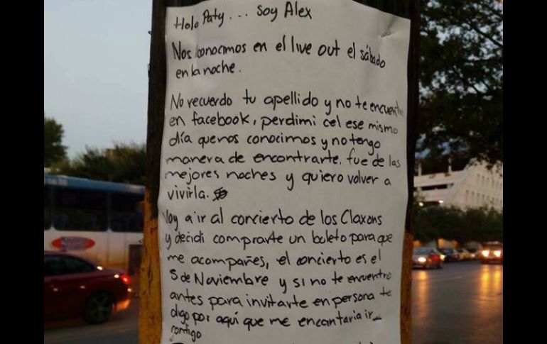 CIUDAD DE MÉXICO (04/OCT/2016).- Un joven llamado Alex conmocionó a las redes sociales tras pegar un cartel con un mensaje para “Paty”, una chica que supuestamente conoció el sábado pasado y que ahora busca incansablemente en Monterrey, Nuevo León.El mensaje desató decenas de comentarios en Twitter, cuyos usuarios incluso crearon hashtags como #TodosSomosAlex, #BuscandoAPaty y #TengoDosBoletos.¿De qué se trata?El asunto comenzó cuando el joven colocó un mensaje en el que le recuerda a “Paty” que se conocieron en el Live Out la noche del sábado.Pero le comenta que no la encuentra en Facebook, que no recuerda su apellido, que perdió su celular y que no tiene manera de encontrarla.Le dice que fue de las mejores noches y que quiere volver a vivirla. Por eso, se decidió a pegar el cartel donde le dice que irá al concierto de los Claxons y que compró dos boletos porque quiere ir con ella. La esperará en la puerta principal, según su mensaje.La foto de dicho cartel fue subida a redes sociales, incluida la cuenta de Twitter del grupo musical, y ha sido replicada varias veces, con mensajes de usuarios como:"#TodosSomosAlex Le voy a decir a mi mamá que busque a Paty, ella siempre encuentra todo"."Ojala yo fuera Paty en esta bonita historia de "amor" #TodosSomosAlex"."Ojala que el amor de mi vida me este buscando así como Alex busca a #Paty #TodosSomosAlex"."#TodosSomosAlex ayudémoslo a encontrar a Paty, pero que nos cuenten el desenlace, luego dejan a una con la duda".También en Facebook, Los Claxons publicaron un video de apoyo a Alex, y le piden a “Paty” que se reporte.
