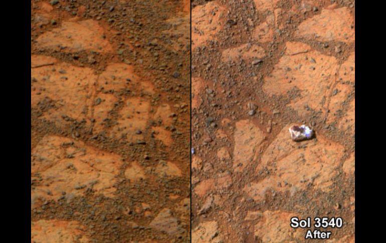 Tecnología | Científicos estudian fotografías de un mismo lugar donde apareció una extraña piedra La NASA analiza roca marciana salida de la nada Científicos están intrigados por fotografías de un mismo lugar donde apareció una extraña piedra Por: AP 21 de enero de 2014 - 20:49 hs Imagen de las fotografías tomadas por la sonda Opportunity, del antes (i) y después (d) del sitio donde apareció la roca. AP / CALIFORNIA, ESTADOS UNIDOS (21/ENE/2014).- Los científicos de la NASA están intrigados por una imagen de una roca en Marte, que no aparecía en las fotografías anteriores del mismo lugar tomadas por la sonda Opportunity, y que se asemeja a un "pastelillo relleno de jalea". A principios de este mes, la sonda Opportunity tomó una imagen de la roca, que pareció surgir de la nada. Todo su exterior es blanco y el centro es rojo oscuro. El científico jefe Steve Squyres tiene una hipótesis. En una presentación la semana pasada, dijo que probablemente una de las ruedas de Opportunity pateó la roca, que luego se deslizó hasta su campo de visión. Las primeras pruebas realizadas a la parte de la roca que parece "jalea" revelaron características distintas a la de cualquier otra roca descubierta por la sonda durante su década de trabajo en Marte. La roca es rica en azufre y magnesio, y los científicos tratan de averiguar por qué. Temas Marte NASA Astronomía Recibe las últimas noticias en tu e-mail Todo lo que necesitas saber para comenzar tu día Registrarse implica aceptar los Términos y Condiciones