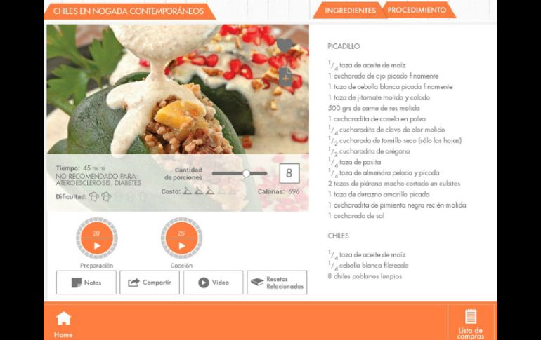 Tecnología | 'Chef' diseña menús, guarda recetas favoritas y crea listas personalizadas de compras Lanzan colección de aplicaciones de Gastronomía 'Chef' diseña menús, guarda recetas favoritas y crea listas personalizadas de compras Por: NTX 18 de mayo de 2015 - 19:28 hs La app permite buscar recetas de acuerdo a su ingrediente principal, origen, costo y tipo. ESPECIAL / play.google.com CIUDAD DE MÉXICO (18/MAY/2015).- Diseñar menús para ocasiones específicas, crear listas personalizadas de compras, guardar recetas favoritas y tomar fotografías de platillos para compartirlas en redes sociales, son algunas de las posibilidades que ofrece una nueva colección de aplicaciones (apps) para el ramo gastronómico. Lanzada al mercado mexicano por Larousse, la colección fue diseñada para usuarios de dispositivos móviles con sistemas operativos iOS y Android, lo que ha colocado a esa empresa a la vanguardia en materia de productos que solucionan necesidades de consulta en gastronomía. La app "Chef" permite buscar una gran variedad de recetas de acuerdo con su ingrediente principal, origen, costo y tipo. Además, ajusta las cantidades de ingredientes de la receta para el número exacto de porciones que se desean. Esta herramienta puede crecer al gusto del usuario, que la puede enriquecer con los recetarios "Salsas mexicanas", "Clásicos mexicanos de Ricardo Muñoz Zurita", "Cocina internacional" y los nuevos títulos que van apareciendo. " Cocina en un 2x3" incluye fáciles y sencillas recetas que se preparan en minutos, y se presenta como ideal para los novatos en la cocina o con la agenda muy apretada. Bajo la premisa de que la cocina rápida no tiene por qué ser sinónimo de comida sin calidad e insípida, la aplicación muestra cómo existen formas muy novedosas para combinar y preparar los alimentos en tiempos muy cortos, sin caer en lo monótono. " Desayunos" toma en cuenta que éste es el alimento más importante del día, de ahí que sugiere iniciarlo con algo delicioso. Para ello, la app anima al usuario a aventurarse en la cocina y preparar el platillo perfecto dentro de tres categorías que complacerán a todos los paladares. Una de las preocupaciones más extendidas de este tiempo es " Adelgazar" y para mostrar que bajar de peso puede ser delicioso, fue lanzada esta aplicación que ofrece una serie de platillos pensados en atender las preocupaciones de salud y belleza del usuario. " Dulces tentaciones" permite ingresar al mundo de las tentaciones difíciles de resistir y preparar esas delicias que complacen a familiares, amigos y visitas por igual. Pero si de " Parrilladas" se trata, la aplicación promueve aventurarse en las técnicas del sabor antiguo, un método de cocción placentero y divertido. Todas las apps permiten guardar las recetas favoritas, incluyendo ingredientes, pasos detallados, fotografías, videos de técnicas básicas y un glosario ilustrado. Destaca el hecho de que una vez instaladas las apps en los dispositivos móviles no se requiere conexión a Internet para realizar las consultas. Temas Gadgets Gastronomía Calor de hogar Aplicaciones Lee También Así puedes saber si una app está caída y verificar que no solo te pasa a ti Los mejores MEMES sobre la caída masiva de Didi Didi se pronuncia sobre la caída de la app: ¿qué pasó con el servicio? Buen Fin 2025: Estas tiendas en línea y apps tendrán descuentos Recibe las últimas noticias en tu e-mail Todo lo que necesitas saber para comenzar tu día Registrarse implica aceptar los Términos y Condiciones