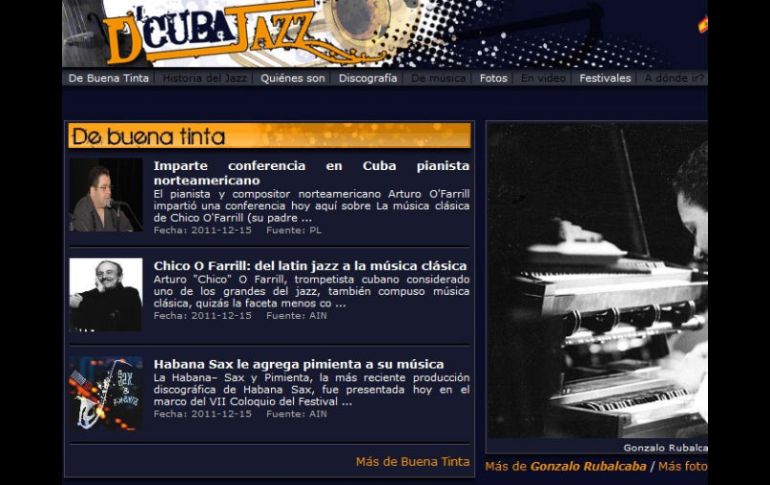 Tecnología | Cuenta con disponibilidad en español, inglés y francés Lanzan portal en Internet de jazz cubano Los interesados podrán encontrar diferentes secciones donde los usuarios disfrutarán de notas de actualidad o de interés sobre el género Por: EL INFORMADOR 23 de diciembre de 2011 - 13:33 hs La página principal se compone de las secciones Historia del jazz y Quiénes son. ESPECIAL / LA HABANA, CUBA (23/DIC/2011).- Fruto de una intensa labor de investigación y de recuperación de materiales es D´Cubajazz, un nuevo sitio en Internet dedicado al ritmo sincopado, en el que seguidores de la música cubana podrán encontrar la información más actualizada sobre las creaciones y los autores de la isla. Igualmente, los interesados podrán encontrar diferentes secciones donde los usuarios disfrutarán de notas de actualidad o de interés sobre el jazz, sus creadores y principales interpretes en Cuba. Dicho sitio, además, cuenta con disponibilidad para ser visitado a través de los idiomas español, inglés y francés. La página principal se compone de las secciones Historia del jazz y Quiénes son, con una breve referencia a la vida de importantes figuras del género como Arturo O'Farrill (1921-2001), Chucho Valdés (1941), Gonzalo Rubalcaba (1963) y Chano Pozo (1915-1948), entre otros. También se puede tener acceso a la sección Discografía, donde se muestran joyas del género sincopado, fruto de la obra de importantes autores como Bobby Carcassés y Blood Lines. De acuerdo con los últimos informes de los fundadores del portal, esta sitio electrónico es resultado de la labor de especialistas de Cubarte, quienes presentaron formalmente este sitio durante el VII Coloquio del Festival Internacional Jazz Plaza 2012. En el acto, Rafael de la Osa, director de Cubarte, agradeció al periodista José Dos Santos por sus aportes. Mientras que la comunicadora Dunieska Castañeda explicó las características de este producto digital, al cual calificó como un sitio muy completo y con gran cantidad de información. Temas Internet JAZZ Lee También Internet Bienestar: Pasos para conservar tu número móvil Plataforma de Hulu llegará a México; esto se sabe ¿Cómo funciona la dieta cognitiva? ¿Cómo puedo descargar mi recibo de luz de CFE? Recibe las últimas noticias en tu e-mail Todo lo que necesitas saber para comenzar tu día Registrarse implica aceptar los Términos y Condiciones