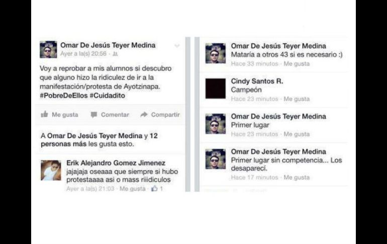 Tecnología | El yucateco publica 'Mataría a otros 43 si es necesario' y borra su cuenta de Facebook Maestro amenaza con reprobar si se manifiestan por normalistas El yucateco publica 'Mataría a otros 43 si es necesario' y horas después borra su cuenta de Facebook Por: SUN 22 de noviembre de 2014 - 17:03 hs Sus publicaciones causaron descontento y repudio en el estado. ESPECIAL / Facebook MÉRIDA, YUCATÁN (22/NOV/2014).- Muestras de descontento y repudio causó un docente de Yucatán al publicar en su cuenta de Facebook que reprobaría a sus alumnos si acudían a la manifestación de protesta por el caso Ayotzinapa. Ayer viernes poco después de las 22:00, el maestro Omar de Jesús Téyer Medina, quien labora para varias universidades privadas de Mérida, comentó en su muro lo siguiente: "Voy a reprobar a mis alumnos si descubro que alguno hizo la ridiculez de ir a la manifestación/protesta por Ayotnizapa #PobredeEllos #Cuidadito". Posteriormente, el profesor comentó lo siguiente "Mataría a otros 43 si es necesario", lo que provocó la ira en redes. El comentario se viralizó con comentarios negativos y provocó que más internautas rastrearan su nombre, e incluso aseguraron haberlo encontrado en un anuncio de una página para contratar servicios de strippers. A las pocas horas, ante la ola de reclamos, insultos y reproches que recibió por sus comentarios, Téyer Medina cerró su cuenta en Facebook. En Mérida, alumnos de diversas universidades y centros educativos se han sumado a las marchas en apoyo a los 43 normalistas de Ayotzinapa desaparecidos. Temas Internet Guerrero Facebook Manifestaciones en México Escándalos en redes sociales Lee También La distopía de Clara Brugada El efecto Donald Trump Gobierno federal refuerza combate a extorsión y desapariciones Músculo y distancia Recibe las últimas noticias en tu e-mail Todo lo que necesitas saber para comenzar tu día Registrarse implica aceptar los Términos y Condiciones