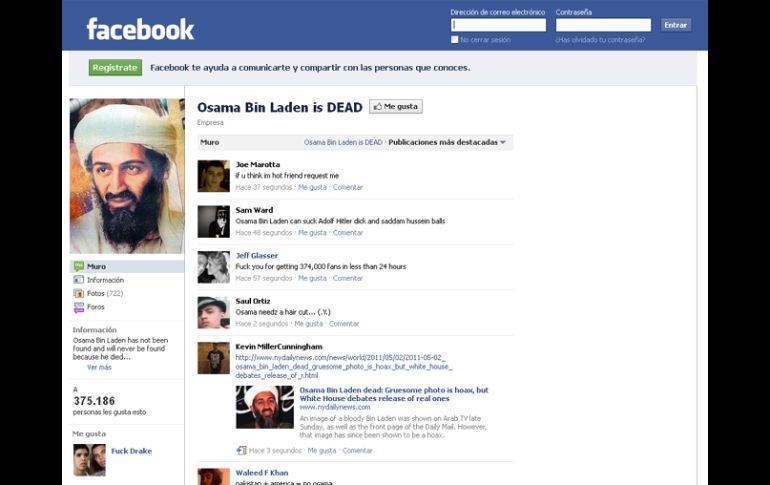 Tecnología | Una avalancha de ocurrencias invade las redes sociales Muerte de Bin Laden despierta creatividad en cibernautas Además de ayudar a propagar la noticia el internet también se ha puesto creativo con la muerte del terrorista Por: EFE 2 de mayo de 2011 - 13:52 hs En la fotografía se observa una imagen del sitio en Facebook ''Osama Bin Laden is DEAD''. ESPECIAL / WASHINGTON, ESTADOS UNIDOS (02/MAY/2011).- Las redes sociales se convirtieron hoy en escenario de infinitas ocurrencias sobre la muerte del líder de la red terrorista Al Qaeda, Osama Bin Laden, después de que anoche contribuyeran a propagar rápidamente la noticia. La página de Facebook "Osama Bin Laden is DEAD" (Osama Bin Laden está muerto), creada anoche al compás de los primeros rumores del fallecimiento, logró congregar en doce horas a más de 250 mil seguidores, una cifra que continúa creciendo cada minuto. Además, tras confirmarse la muerte, el unánime grito de "USA, USA, USA", ha dado paso hoy a un sinfín de lemas, fotomontajes y caricaturas que canalizan la euforia que ha generado entre los estadounidenses, sobre todo entre los más jóvenes, la muerte del terrorista más buscado. Por 16 dólares quien lo desee puede adquirir una camiseta que reza "I killed Osama" (yo maté a Osama), en venta a través de Internet. En los fotomontajes el terrorista comparte protagonismo con el presidente de EU, Barack Obama, quien en muchos de ellos aparece erigido en héroe nacional tras haber acabado con el enemigo número uno del país. "Lo siento si tardé tanto en enseñarles mi certificado de nacimiento, estaba demasiado ocupado matando a Osama", reza un fotomontaje en el que aparece un Obama sonriente y con gafas de sol. La semana pasada el mandatario estadounidense había asegurado que el país no estaba para "tonterías" al referirse a la polémica desatada en torno a su lugar de nacimiento, que llevó a la Casa Blanca a divulgar el certificado completo. En otra de las imágenes publicadas hoy puede verse al presidente de EU junto al príncipe Guillermo de Inglaterra y a su esposa Catalina Middleton bajo el título: "Ustedes tienen una boda, pero yo tengo un funeral". Algunos internautas también se han sumado a la opinión de que la muerte de Bin Laden puede dar un gran impulso a Obama en su búsqueda de la reelección y lo han reflejado en fotomontajes donde se ve al presidente diciendo: "Esto serán dos mandatos, gracias", o "Cuatro años más". A cada segundo en Facebook aparecen nuevos lemas como "Obama 1-Osama 0" o "quiero que Lady Gaga haga una canción llamada Osama". Pero los mensajes con mejor acogida son los que cuestionan los diez años que le costó a EU dar con el paradero del terrorista: "Google maps puede encontrarlo todo, ¿por qué no lo usamos antes?". Otro fotomontaje aprovecha la polémica sobre la privacidad de los datos en los teléfonos inteligentes e ironiza: "¿A él lo habrán encontrado por culpa de su iPhone?. Pruebas de ADN confirmaron que Bin Laden murió este domingo en el asalto a la residencia donde se ocultaba en las afueras de Islamabad. Temas Internet Computación Osama Bin Laden Lee También Internet Bienestar: Pasos para conservar tu número móvil Plataforma de Hulu llegará a México; esto se sabe ¿Cómo funciona la dieta cognitiva? ¿Cómo puedo descargar mi recibo de luz de CFE? Recibe las últimas noticias en tu e-mail Todo lo que necesitas saber para comenzar tu día Registrarse implica aceptar los Términos y Condiciones