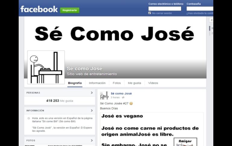 Tecnología | Es un meme con ejemplos a seguir por sus buenos hábitos ¿Qué es 'Sé como José' y porqué debo ser como él? Es un meme con ejemplos a seguir por sus buenos hábitos Por: EL INFORMADOR 7 de enero de 2016 - 12:33 hs José es el meme que te enseña a usar correctamente tus redes sociales FACEBOOK / SeComoJoseOfficial GUADALAJARA, JALISCO (07/ENE/2016).- Este 2016 ha iniciado ya con varios memes, y entre ellos el más famoso: "Sé inteligente, sé como José". Este meme ocupó tan sólo cuatro días para hacerse viral en las redes sociales de todo el mundo, convirtiéndose en trending topic. Se trata de un muñeco muy simple, sin perspectiva ni dimensión, está dibujado con solamente un círculo y palitos; además trata de ser muy sarcástico. Este meme representa varias situaciones del internet, y busca qué con sus comentarios se eliminen las malas prácticas o los malos hábitos que las personas acostumbran tener en las redes sociales, por ejemplo; "José siente un movimiento sísmico. José ya sabe que hacer. José corre a ponerse en un lugar seguro, porque su vida es más importante que publicar que está ocurriendo un sismo. Sé inteligente. Sé como José". Ha sido tan popular que ya cuenta con su propia página de Facebook, la cual publica varias imágenes de José, todas con distintos temas actuales; fue creada el 2 de enero de 2016 y registra actualmente más de 400 mil segidores. Ya tiene amigos, Juan y Josefa; la última es la versión femenina de José, que aconseja y enseña en correcto uso de las redes sociales a todas las mujeres. ¿Cuál es su origen? Nació en Italia, con su nombre original “Sii come Bill”, por lo que "Sé como José" es la versión en español, pero ambos transmiten el mismo tipo de mensajes. Sus creadores pretendían representar a una persona sencilla, por eso, iniciando desde el dibujo lo hicieron tan simple que hasta un niño de kinder lo podría hacer. Ya ha llegado a muchos paises, teniendo en algunos un nombre diferente, por ejemplo; en Latinoamérica y España es "Sé como José, mientras que en USA es "be like Bill", teniendo cinco mil seguidores en su pagina de Facebook. Intenta ser una persona que no publica basura en Facebook, no es un amigo falso en Whatsapp, no se queja de la escuela, y respeta a los demás. En resumen, Bill o José son un ejemplo a seguir, sobretodo socialmente, al menos una vez en la vida. Temas Internet Facebook Redes Sociales Lee También Bad Bunny permanece sentado durante "God Bless America" y enciende las redes Alcalde de Tulum anuncia acceso libre a playas, pero sin alimentos ni bebidas Internet Bienestar: Pasos para conservar tu número móvil Esta es la verdadera identidad del "Juan Gabriel" captado en París Recibe las últimas noticias en tu e-mail Todo lo que necesitas saber para comenzar tu día Registrarse implica aceptar los Términos y Condiciones