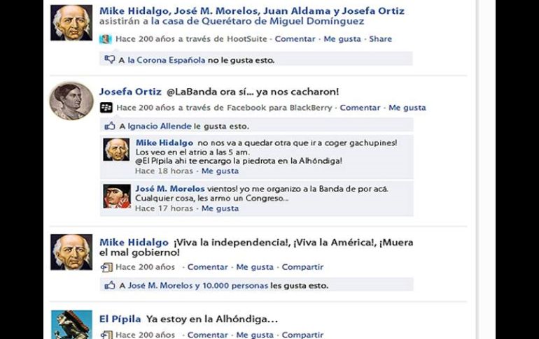Tecnología | El correo circula por Hotmail ''Recrean'' la Independencia de México por Facebook Una imagen recrea lo que hubiera pasado si la Independencia del país se hubiera proclamado mediante la red social Por: EL INFORMADOR 14 de septiembre de 2010 - 17:26 hs Aparecen personajes como el Pípila, Ignacio Allende y la Corona Española. ESPECIAL / GUADALAJARA, JALISCO (14/SEP/2010).- Con la celebración del Bicentenario de la Independencia de México a pocas horas de realizarse, los mexicanos muestran su creatividad y recrean lo que hubiera pasado si ''El Grito'' y las manifestaciones de Independencia hubieran ocurrido con la ayuda de la red social Facebook. En el correo electrónico Hotmail, circula un mail con la imagen ficticia de los insurgentes en Facebook en la que se recrean los perfiles de Miguel Hidalgo como ''Mike Hidalgo'', José M. Morelos, Juan Aldama, Josefa Ortíz, ''El Pípila'', entre otros conocidos personajes. Diferentes aplicaciones de Facebook son utilizadas para recrear los hechos reales de forma creíble en la red social. EL INFORMADOR/ ILSE MARTÍNEZ Temas Internet Hotmail Facebook Bicentenario Independencia Lee También Internet Bienestar: Pasos para conservar tu número móvil Plataforma de Hulu llegará a México; esto se sabe ¿Cómo funciona la dieta cognitiva? ¿Cómo puedo descargar mi recibo de luz de CFE? Recibe las últimas noticias en tu e-mail Todo lo que necesitas saber para comenzar tu día Registrarse implica aceptar los Términos y Condiciones