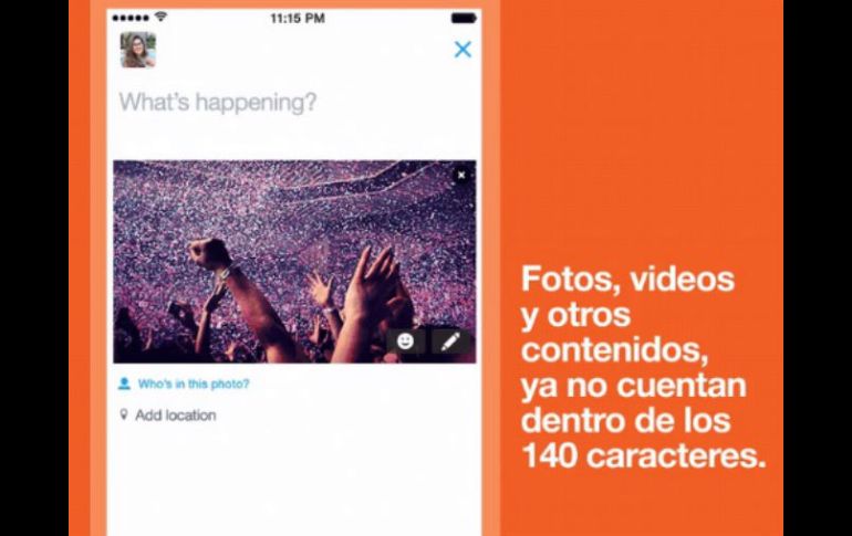 WASHINGTON, ESTADOS UNIDOS (19/SEP/2016).- La red social Twitter flexibilizó el lunes la regla que limita sus tuits a 140 caracteres, anunciando que las fotos ya no serán contabilizadas en el contenido de los mensajes."¡Diga más con sus 140 caracteres! Fotos, videos, GIF, preguntas y citas ya no serán contabilizadas", tuiteó el grupo que busca ampliar su audiencia y lograr beneficios.En medio de rumores de que Twitter estaría buscando recortar costos o incluso ser adquirido, la empresa con sede en San Francisco ha sumado servicios, incluyendo videos en vivo.La última decisión flexibiliza aunque no elimina totalmente el límite de 140 caracteres, que había sido establecido a causa de las limitaciones existentes para los mensajes de texto transmitidos por celular cuando Twitter fue lanzado en 2006.Los analistas advierten que Twitter necesita encontrar medios para atraer usuarios más allá del núcleo de celebridades, políticos y periodistas, cuyo número se ha estancado en el último año.En la actualización de su último trimestre, Twitter anunció que el número mensual de usuarios activos alcanzó 313 millones, un 3% más que un año atrás y superando levemente los 310 millones del trimestre anterior.Twitter no ha dado beneficios todavía, aunque incrementó notoriamente sus recursos de marketing.