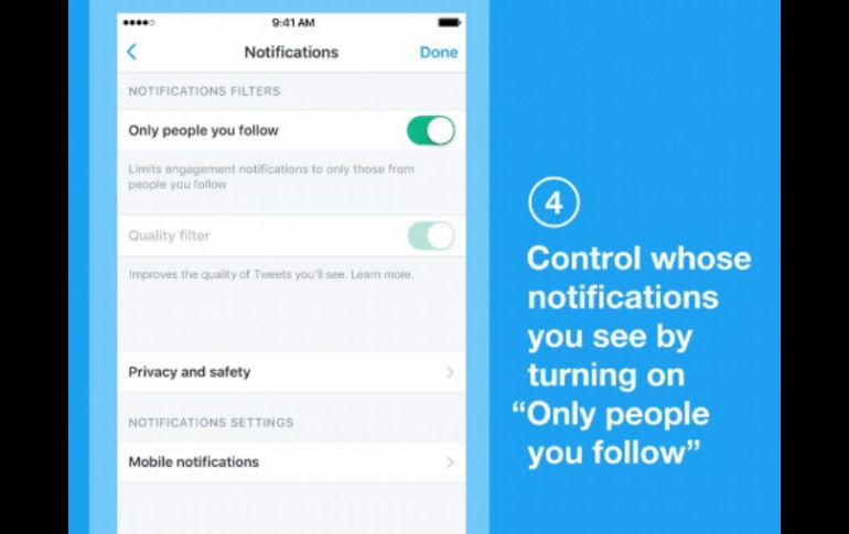 CIUDAD DE MÉXICO (18/AGO/2016).- ¿No quieres recibir notificaciones de todas las personas? A partir de hoy podrás limitar las notificaciones únicamente a las personas que sigues, tanto en la aplicación de Twitter como en la web.La red social anunció nuevos recursos para darte más control sobre lo que ves y con quien interactúas.El nuevo filtro de calidad se activa y se desactiva cuando quieras y no afecta las cuentas que sigues o con las que has interactuado últimamente.Cuando está activado, el filtro puede mejorar la calidad de los Tweets que ves al utilizar una variedad de señales, tales como el origen de la cuenta y el comportamiento.Activando la opción, contenidos de baja calidad, como Tweets duplicados o que parezcan automatizados, no aparecerán en sus notificaciones y otras partes de su experiencia en Twitter.Este recurso no filtra el contenido de personas que sigues o de cuentas con las que has interactuado recientemente – y a depender de sus preferencias, puedes activar o desactivar esta función en la configuración de notificaciones.