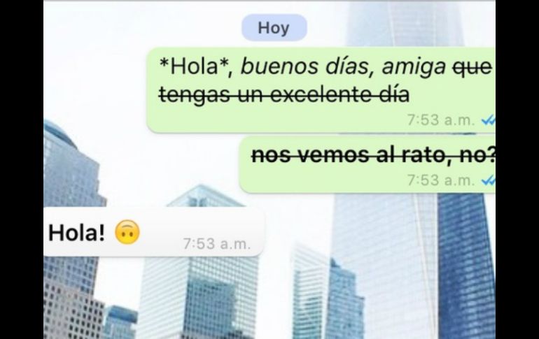 Tecnología | La 'app' de mensajería instantánea presenta su nueva actualización WhatsApp introduce cursiva, negritas y tachado en textos La 'app' de mensajería instantánea presenta su nueva actualización Por: EL INFORMADOR 30 de marzo de 2016 - 07:25 hs Por el momento sólo ha llegado a dispositivos iOs y a usuarios que manejen en sus dispositivos la última versión de Android. ESPECIAL / GUADALAJARA, JALISCO (30/MAR/2016).- La popular aplicación de mensajería instantánea ha presentado una nueva actualización, la cual permite escribir el texto en cursiva, negritas o tacharlo. En días pasados, WhatsApp ya había introducido la posibilidad de compartir documentos en PDF y ahora presenta esta última opción para utilizar dentro del chat. Dicha novedad por el momento sólo ha llegado a dispositivos iOS y a usuarios que manejen en sus dispositivos la última versión de Android, que actualmente está disponible solamente en versión beta. Si el destinatario del mensaje no cuenta con la actualización, no podrá ver las palabras editadas. Quien desee darlo de alta como ''tester'', puede hacerlo a través de este enlace. Para utilizar las nuevas opciones sigue los siguentes pasos: Negrita. Encierra entre asteriscos las palabras que vayan a aparecer. Ejemplo: *Informador* Cursiva. Pon entre guiones bajos las palabras. Ejemplo: _Informador_ Tachar texto. Situa las palabras entre virgulilla. Ejemplo: ~Informador~ Para usar varios recursos al mismo tiempo, sólo tendrás que combinarlos, encerrando unos sobre otros. Ejemplo: ~*_Informador_*~ EL INFORMADOR/ERICA DONAJÍ Temas Internet Telefonía Celular Smartphones Redes Sociales Aplicaciones WhatsApp Lee También Bad Bunny permanece sentado durante "God Bless America" y enciende las redes Alcalde de Tulum anuncia acceso libre a playas, pero sin alimentos ni bebidas Revelan cómo será el primer iPhone plegable que planea lanzar Apple Internet Bienestar: Pasos para conservar tu número móvil Recibe las últimas noticias en tu e-mail Todo lo que necesitas saber para comenzar tu día Registrarse implica aceptar los Términos y Condiciones