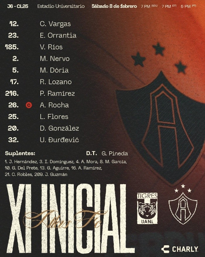 Deportes | Tigres vs Atlas • Momentos Destacados • Jornada 6 • Clausura 2025 Atlas intentará romper su mala racha y sumar su primera victoria del torneo en su visita a los Tigres Sergio Alejandro Velázquez 8 de febrero de 2025 - 17:00 hs TIGRES2 ‒ 1ATLAS Fin del partido 90+6' Tarjeta roja para Tigres Guido Pizarro es expulsado del encuentro tras una falta sobre Uros Djurdjevic muy cerca del área local. 90' Agregan 11 minutos al segundo tiempo 88' Modificaciones en ambos equiipos En Tigres salen Diego Lainez, Nicolás Ibañez y Romulo para dejar entrar a Uriel Antuna, Sebastián Córdova y Rafael Carioca. En Atlas salen Paulo Ramírez y Carlos Orrantia para dejar entrar a Mateo García e Idekel Domínguez. 77' Atlas realiza modificaciones Salen: Leonardo Flores y Rivaldo Lozano. Entran: Matias Cóccaro y Jorge Guzmán. 66' ¡Gooooooool de Tigres! Ozziel Herrera avanza hasta el extremo del área y realiza un disparo cruzado para terminar concretando un golazo. ¡GOLAZO de Ozziel! Tigres toma la ventaja en el marcador ⚽#MásAcciónMásDiversión #SábadoNoterño @calientesports te presenta los mejores momentos mientras apuestas y ganas con la #LigaMX https://t.co/cfoRkRMUnP EN VIVO: https://t.co/gIApDIQfyr pic.twitter.com/l8crY5cdZq — TV Azteca Deportes (@AztecaDeportes) February 9, 2025 65' Modificaciones en ambos equipos En Tigres sale Raymundo Fulgencio para dejar entrar a Ozziel Herrera. En Atlas Diego González deja el terreno de juego para dar entrada a Gustavo del Prete. 58' Tigres insiste en el ataque Los locales han liderado las acciones desde el comienzo del segundo tiempo, pese al arranque accidentado de esta segunda mitad. Tras diversas pausas por faltas y por la gestión arbitral, Tigres mantiene presencia en el área del Atlas y amenaza con desempatar el partido. 52' Una amonestación más para el Atlas Rivaldo Lozano recibe amonestación para el conjunto rojinegro. 47' Atlas recibe tarjeta amarilla Uros Djurdjevic recibe amonestación para el conjunto rojinegro en el arranque del segundo tiempo. Comienza el segundo tiempo Fin del primer tiempo 45+4' Aldo Rocha falla el penal El capitán rojinegro busca el ángulo superior durante su tiro, sin embargo, el balón termina impactando contra la parte alta del travesaño. 45+1' ¡Penal en favor de Atlas! Tras una falta dentro del área de Tigres y la revisión en el VAR por parte del árbitro, se insica la pena máxima para el cinjunto local. Aldo Rocha será quien marque el penal. 45' Agregan 5 minutos al primer tiempo 41' ¡Atlas empata el encuentro! Rivaldo Lozano se encuentra el balón en el corazón del área para rematarlo e igualar el marcador. ¡Lo empató el Atlas! Lozano se encuentra con el gol tras un error de Angulo #MásAcciónMásDiversión #SábadoNoterño @calientesports te presenta los mejores momentos mientras apuestas y ganas con la #LigaMX https://t.co/cfoRkRMUnP EN VIVO: https://t.co/gIApDIQfyr pic.twitter.com/lWyYuxYero — TV Azteca Deportes (@AztecaDeportes) February 9, 2025 33' Atlas se mantiene buscando Tras la anotación de Tigres, los rojinegros se han mantenido buscando espacios hacia la portería, mientras que los locales defienden y aprovechan algunas las aperturas del Atlas para alcanzar la segunda anotación. 21' ¡Gooooooool de Tigres! Juan Brunetta se posiciona bien frente al arco de Camilo Vargas tras un desvío de Nicolás Ibañez para realizar el remate con el que se abre el marcador del encuentro. Tigres toma la ventaja. ¡GOOOOL de Brunetta! ⚽ Tigres abre el marcador con una gran jugada en equipo #MásAcciónMásDiversión #SábadoNoterño @calientesports te presenta los mejores momentos mientras apuestas y ganas con la #LigaMX https://t.co/cfoRkRMUnP EN VIVO: https://t.co/gIApDIQfyr pic.twitter.com/H4v8KuMDzS — TV Azteca Deportes (@AztecaDeportes) February 9, 2025 18' Los rojinegros comienzan a atacar Atlas comienza a tener aproximaciones al arco de Nahuel Guzmán, pese a no realizar llegadas claras, la posesión del balón empieza a equilibrarse. 12' Atlas se enfoca en la defensa Los rojinegros se mantienen defendiendo su área ante la búsqueda constante de Tigres por generar jugadas, al momento el equipo visitante sólo ha tocado el balón en breves oportunidades para intentar acercarse a la portería rival, pero las jugadas de peligro han tardado en llegar para el Atlas. 4' Tigres comanda las acciones en el inicio Durante los primeros minutos del encuentro, Tigres ha capitalizado las acciones ofensivas y ha tenido una breve presencia dentro del área de los rojinegros. Los locales focalizan las acciones en encontrar el camino desde la mitad del campo hasta el arco de Camilo Vargas. Arranca el partido El árbitro da el silbatazo y arranca el encuentro sobre la cancha del estadio Universitario. Alineación de Atlas Alineación de Tigres Equipo titular listo para el duelo de esta noche. Alineación @CEMEXMx.#SiempreContigo #EstoEsTigres pic.twitter.com/wan9PczWBZ — Club Tigres (@TigresOficial) February 9, 2025 Transmisión del encuentro El enfrentamiento entre Tigres y Atlas abrirá la jornada sabatina del Clausura 2025 en la Liga MX. El partido se jugará en el Estadio Universitario este 8 de febrero a las 19:00 horas (tiempo del centro de México), donde los felinos buscarán retomar el liderato tras un tropiezo en la Concachampions. Mientras tanto, Atlas intentará romper su mala racha y sumar su primera victoria del torneo. Para seguir el partido en vivo, la transmisión estará disponible en Azteca 7 y a través de la plataforma digital de Azteca Deportes. SV Temas Liga MX Atlas Tigres Futbol Mexicano Clausura 2025 Lee También Atlas sigue sin ganar y sufre una dolorosa derrota ante Tigres Eduardo Aguirre se pierde el duelo ante Tigres por lesión Santiago Giménez y otros mexicanos que anotaron en su debut en ligas top de Europa ¿Cómo hacer guacamole para ver el Super Bowl 2025?
