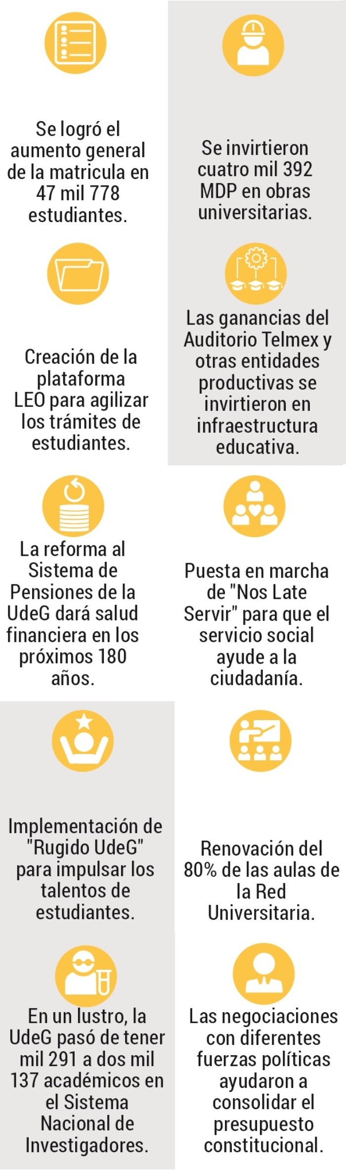 Ricardo Villanueva, rector de la Universidad de Guadalajara (UdeG), rindió su Quinto Informe de Actividades, en el que presumió principalmente dos logros: el aumento de la matrícula a través de la generación de más infraestructura educativa, pese a los problemas enfrentados por la falta de recursos federales y estatales, y la consolidación del presupuesto constitucional. Con respecto al primer punto, el líder universitario señaló que el incremento de las aulas permitió recibir a casi 48 mil alumnos durante su gestión. Acentuó que con la construcción de cuatro centros universitarios en Guadalajara (en la exsede de La Normal), Tlaquepaque, Chapala y Tlajomulco de Zúñiga se sumarán otros 50 mil en los siguientes años, y con la conclusión de tres prepas (en el sur de la Perla Tapatía, Tonalá y Tlajomulco) se aceptará a todos los aspirantes a bachillerato. Resaltó los ahorros de un lustro para invertir en salones, butacas, pantallas, computadoras, laptops, puntos de internet, comedores, laboratorios, lockers, ciclopuertos, bicicletas, mobiliarios, gimnasios, canchas y aulas digitales, entre otros elementos. Indicó que los estudiantes no sólo aprenden en los planteles, pues más de cuatro mil 400 acudieron al Centro Cultural Universitario, en donde tomaron clases para aprender más detalles de la naturaleza, de la imaginación, de otras culturas, pero también para perder el miedo al escenario o saber de ficción o de ciudadanía. “Aun cuando no había aumento presupuestal y en términos reales vivimos un decrecimiento, en ese escenario nunca paramos de crecer. En estos cinco años escuchamos a los más de 335 mil estudiantes que tenemos, tomamos en cuenta sus prioridades. Ellos decidieron muchísimas cosas que ya son una realidad en sus escuelas”, dijo durante el mensaje que ofreció ayer en el Auditorio Telmex. En relación al segundo tema, acentuó que la nueva bolsa, que a partir de 2025 otorgará el 5% del Presupuesto de Egresos del Estado de manera anual, y que se consiguió en medio de la discordia con el Gobierno estatal por el recorte de 140 millones de pesos (MDP) al Museo de Ciencias Ambientales, es una muestra de “alta política”. “Gracias por la aprobación unánime de diputadas y diputados, y de 123 ayuntamientos sin un solo voto en contra de ningún regidor. La conquista de nuestro presupuesto constitucional es una consecuencia de una decisión de Estado con E mayúscula. Estimado gobernador, esta iniciativa y el cierre de nuestras administraciones narran el verdadero triunfo de la razón. Qué bueno que no nos fuimos a las campañas, qué gran error hubiéramos cometido”. Agregó: “los universitarios estamos obligados a ver esto como lo que es: la mayor responsabilidad que los jaliscienses nos han dado en toda nuestra historia. Por eso hay que dar todo nuestro esfuerzo para ser útiles y pertinentes para los jóvenes que estudian en nuestras aulas y para aquellos que no han podido llegar a la Universidad”. Por su parte, el gobernador respondió que si bien hubo diferencias entre su Gobierno y la Universidad, hubo más coincidencias para ofrecer mejores oportunidades a la población de la Entidad. Además, le entregó al rector las escrituras del Paraninfo y del edificio administrativo. “Con el presupuesto constitucional, saldamos una deuda histórica que el Gobierno de Jalisco mantenía con Fray Antonio Alcalde y las futuras generaciones de jaliscienses”. Villanueva también destacó mejoras en áreas como generación de recursos de empresas universitarias y su inyección en infraestructura educativa; las modificaciones para facilitar los trámites que llevan a cabo los alumnos y egresados; los ajustes para asegurar el fondo de pensiones para los próximos 180 años; el cambio en la vocación del servicio social para ayudar a la ciudadanía de diferentes formas; la realización de eventos culturales y el impulso de la investigación por parte de los académicos. A través de sus redes sociales, el gobernador electo de Jalisco, Pablo Lemus, felicitó a Villanueva y enfatizó que ha liderado a la Universidad de manera sobresaliente en materia cultural y educativa. “Como gobernador, seguiré apoyando a nuestra Universidad para que Jalisco tenga un mejor futuro”. El martes, Lemus anunció su respaldo a la conclusión del Museo de Ciencias Ambientales y otros proyectos culturales de la casa de estudios, además de continuar con los trabajos para el crecimiento de la Red Universitaria en todo el Estado. El rector de la Universidad de Guadalajara (UdeG), Ricardo Villanueva, contó que tuvo que dejar la oficina para conocer más de cerca los problemas de la casa de estudios. Por ejemplo, recordó, ante un Auditorio Telmex atiborrado de estudiantes, maestros, trabajadores universitarios, políticos y representantes de diferentes grupos sociales de Jalisco, que los alumnos de una prepa en la comunidad de El Tuito, en Cabo Corrientes, enfrentaban las altas temperaturas en medio de sus clases debido a la falta de un transformador que permitiera funcionar a los equipos de aire acondicionado. Como el aparato costaba alrededor de 300 mil pesos, decidió ahorrarlos al cancelar un evento protocolario y arreglar esa situación. Sin embargo, también observó que había falta de agilidad en los trámites que llevaban a cabo algunos estudiantes, como registro de materias, pagos y otros requisitos, por lo que pidió jubilar el Sistema Integral de Información Administrativa Universitaria (SIIAU) para poner en marcha la plataforma LEO, que incluso puede compartirse a las autoridades de la Entidad para facilitar la entrega de apoyos a los universitarios. “Ya estamos diseñando la plataforma para maestros, también nosotros sufrimos. Me comprometo con todos los maestros a que si me demuestren una sola vez en la vida que nacieron, eso será suficiente para cualquier trámite”, añadió. En el mensaje que ofreció por su Quinto Informe de Actividades,