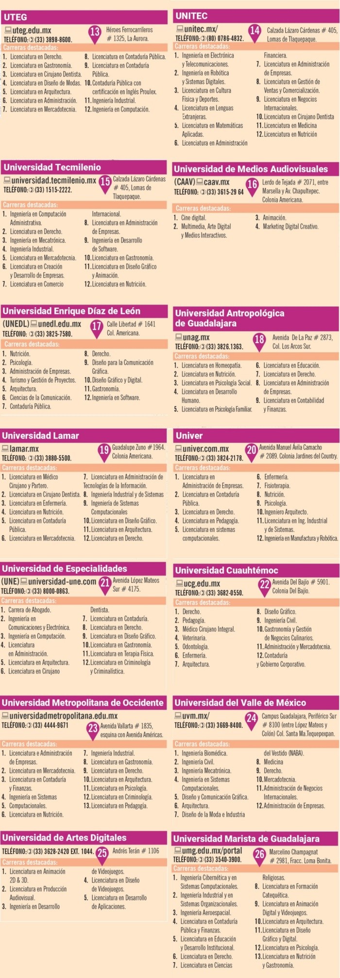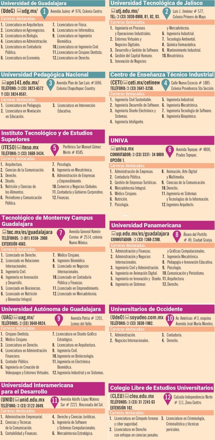 Si bien las universidades públicas en la mayoría de los casos son la primera opción para poder continuar la vida académica, las universidades privadas también son una alternativa para hacerlo, pues en ocasiones ofrecen otros beneficios. Entre ellos se encuentran, por ejemplo, el brindarte horarios específicos para poder estudiar y trabajar, periodos más cortos de estudio, oportunidades de pago, e incluso pueden llegar a ofrecerte licenciaturas o maestrías exclusivas que no son ofertadas en escuelas públicas.De acuerdo con la plataforma “Educaedu”, compañía especializada en la búsqueda de formación académica, en Jalisco hay al menos 47 diferentes universidades privadas que te ofrecen carreras educativas en distintos ámbitos, que pueden ir desde centros de estudio de licenciaturas diversas, hasta los especializados, como el caso de universidades en materia de criminología, de formación para profesorado, de alternativas médicas, medios audiovisuales, entre otros tantos. Entre los que destacan se encuentran los centros universitarios más conocidos como el Instituto Tecnológico y de Estudios Superiores de Occidente (ITESO), que cuenta por ejemplo con la carrera de Ingeniería en Seguridad Informática y Redes, que en México sólo se imparte en este espacio, además de ser la única universidad privada de la Región Centro-Occidente de México con programas de posgrado de excelencia avalados por el Consejo Nacional de Ciencia y Tecnología (Conacyt) y la Sociedad Mexicana para la Divulgación de la Ciencia y la Técnica (Somedicyt). La Universidad Panamericana, es otro de los centros educativos privados que ofrece, además de las carreras habituales, programas exclusivos, como, por ejemplo, es la única escuela en Latinoamérica que ofrece la carrera de Ingeniería Civil y Administración; la única en ofrecer una Ingeniería en Innovación y Diseño; y la única en ofrecer la carrera en Dirección de Negocios Gastronómicos. Otra de las universidades privadas que existen en Jalisco y que cada vez ha sido más solicitada es el Colegio Libre de Estudios Universitarios (CLEU), el cual se especializa en estudios jurídicos, penales, de criminología y criminalística.También está la Universidad de Medios Audiovisuales (CAAV), donde, como su nombre lo dice, se imparten licenciaturas, cursos especializados, diplomados en materia de medios audiovisuales como Cine, Radio, Animación, Diseño, entre otros tantos. Estos son sólo algunos ejemplos, sin embargo, para elegir la mejor opción basta con hacer una búsqueda respecto de los intereses que se tienen, y al encontrar la escuela que se considere brinda la mejor opción para este estudio, confirmar que cuenta con la validación de alguna institución educativa, como por ejemplo la Secretaría de Educación Jalisco, la Secretaría de Educación Pública o alguna otra autoridad nacional o internacional. .