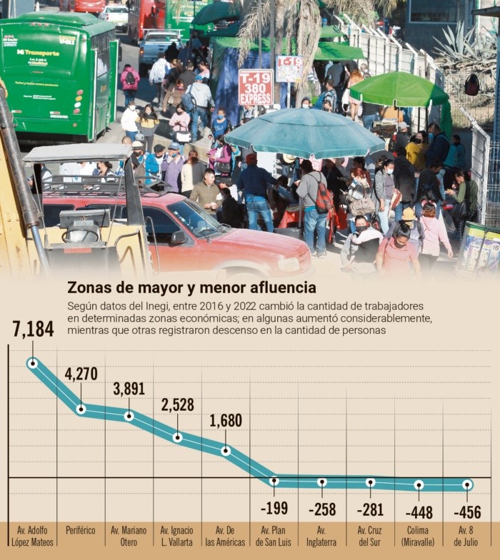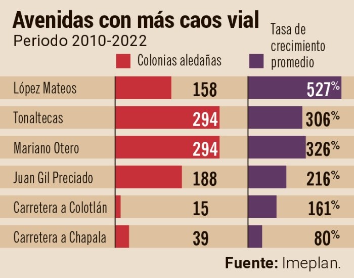 Entre 2010 y 2020, seis vialidades principales de la ciudad registraron el mayor aumento poblacional en sus alrededores, detonando fuertes congestionamientos en horas pico: López Mateos (desde Circuito Metropolitano hasta Periférico), Mariano Otero (hasta el cruce con Periférico), Tonaltecas, Juan Gil Preciado, carretera Colotlán y carretera a Chapala. Un análisis del Instituto Metropolitano de Planeación (Imeplan) destaca que la presión del crecimiento urbano ocurre principalmente en las periferias, donde se cuenta con pocas avenidas. Por ejemplo, López Mateos Sur. “Desde su entronque con el Circuito Metropolitano Sur hasta el cruce con Periférico Sur, comunica a 158 colonias y tiene una tasa de crecimiento promedio del 527% (de 2010 a 2020)”, apunta.La carretera a Colotlán y Juan Gil Preciado requieren especial atención, ya que al tener tasas de crecimiento por arriba del 100% muestran “una saturación de las vialidades”.En el caso de Mariano Otero, se resalta que el tramo que va de La Primavera a Periférico Sur comunica a 294 colonias, “y tiene una tasa de crecimiento promedio del 326%, cifra que muestra cómo parte del desarrollo de la ciudad se ha enfocado en las periferias”.Mientras la periferia gana población, las zonas centrales la pierden o crecen de forma muy lenta, como el Centro de Guadalajara.La velocidad promedio en la Zona Metropolitana de Guadalajara disminuyó de 37 a 32 kilómetros por hora por la saturación vehicular y se pierden 52 horas al año en los atorones viales de acuerdo con un estudio de Imeplan, lo que impacta directamente en el desplazamiento de los trabajadores.César Castro, coordinador del Consejo de Cámaras Industriales de Jalisco (CCIJ), comentó que los atorones en las vialidades afectan la productividad de las empresas.El dirigente de los industriales explicó que a todos los sectores les pega diferente. Por ejemplo, en el sector electrónico la mayoría de las empresas tienen su servicio de transporte tanto para la entrada como a la salida y se programan con base en los puntos de reunión para llevarlos con tiempo suficiente para que lleguen con tiempo a trabajar, principalmente en la Zona Metropolitana de Guadalajara. Pero hay trabajadores que no tienen acceso al transporte porque viven más lejos y tienen que levantarse más temprano para llegar puntuales a la hora de trabajar.Añadió que están trabajando en la Mesa de Vialidad con el Gobierno del Estado donde están analizando opciones de corto, mediano y largo plazo para agilizar el tráfico en la ciudad y otras como el segundo piso de la avenida López Mateos.Los problemas de circulación en López Mateos no son privativos de dicha vialidad, se parecen a los de otras avenidas y se relacionan directamente con el desorden y velocidad de la expansión urbana en zonas aledañas. Así, para quien debe tomar esta vía, los embotellamientos y accidentes son pan de cada día, y cumplir con un horario —sea por trabajo o para llegar a una escuela— se torna materia de suerte.Cada traslado es una batalla de dos sentidos: o se dirigen al cumplimiento de obligaciones o van de regreso a casa. En cualquiera de los casos, la clave puede ser evadir las “horas pico” (nunca es una sola), que pueden cambiar durante los fines de semana. Si años atrás el fin de la urbanización parecía estar en San Agustín, hoy la avenida está cercada por más de una plaza comercial, lo mismo que fábricas o abundantes negocios, a lo que se suma el crecimiento de áreas habitacionales cuyo desarrollo no coincide con el mejoramiento de accesos viales. El parque vehicular se ha impuesto sobre los vecinos de la zona.Todo empeora al adentrarse en la ciudad tras pasar la frontera del Periférico, pues apenas desvía parte de la carga vehicular y la vía parece estrecharse; ir de Las Águilas o Las Fuentes, pasar por La Calma y vencer el cruce con Mariano Otero para internarse en Chapalita (o más allá), es una prueba de paciencia y carácter. Asimismo, los pasos a desnivel de López Mateos no son de mucha ayuda en esos momentos de la jornada cuando uno va o viene de su trabajo.En tiempos en los que se promueve el diálogo para encontrar soluciones al problema, la buena voluntad parece un bien escaso; además, hablar de “modernizar” el transporte público suele disgustar a las autoridades y escuchar cifras de crecimiento poblacional en la zona les asusta (y no sólo a ellos). Peras y manzanas aparte, para quien habita en zonas cercanas a la avenida no parece haber salida en el corto plazo. Si entre Los Gavilanes y Providencia existen diferencias de todo tipo, las une una vía y, como en muchos otros casos, se congestiona casi todo el tiempo.Los constructores de Jalisco esperan que el presupuesto de este año para obra pública, tanto del Gobierno del Estado como de los municipios, ayude a abatir el rezago en movilidad.Juan Manuel Chávez Ochoa, presidente de la Cámara Mexicana de la Industria de la Construcción (CMIC Jalisco), explicó que las principales obras están enfocadas a resolver temas de movilidad, recuperación de espacios, abastecimiento de servicios, escuelas, entre otros proyectos.Entre los proyectos magnos se encuentran la Línea 4, que es la obra más importante que se realiza en este momento, pero también se proyectan diversas obras de infraestructura vial en otros puntos de la ciudad.Entre los polos de desarrollo de este año destacan el Sur de la ciudad, la salida a Colotlán, el hub logístico del aeropuerto y la zona de Tonalá donde se están edificando muchos parques industriales.Este año en Guadalajara se ejercerán más de mil 800 millones de pesos, en Zapopan se destinará un presupuesto de mil 260 millones de pesos para obra pública, Tlajomulco anunció 400 millones de pesos sin contar las aportaciones estatales e infraestructura federal como la Línea 4 y el hub logístico.Por parte del Gobierno del Estado se pretende ejercer más de 35 mil millones de pesos, d