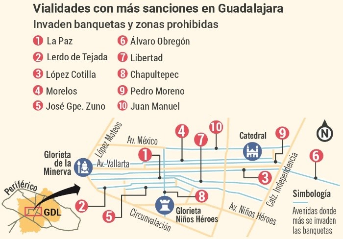 Brenda Ruiz trabaja en una tienda ubicada en avenida La Paz, cerca de Chapultepec. Cuenta que es común ver que los comerciantes invaden las banquetas. También explica que a veces utiliza la bicicleta para no gastar en estacionamiento, pero es frecuente encontrar vehículos en zonas prohibidas. “Las banquetas están invadidas por la gran actividad comercial o los autos”.El Ayuntamiento de Guadalajara informa por Transparencia que las cinco vialidades donde más se incumplió con el Programa Banquetas Libres es La Paz, Lerdo de Tejada, López Cotilla, Morelos y José Guadalupe Zuno, ubicadas en la zona de Chapultepec. Debido a que muchos automovilistas son reincidentes, desde el pasado 5 de junio el Ayuntamiento implementó el programa de inmovilizadores vehiculares, el cual es un complemento del programa de Banquetas Libres para garantizar una Guadalajara más ordenada y accesible, según la descripción del proyecto. Aunque de momento solamente aplica en el Centro Histórico, el presidente municipal, Pablo Lemus, indicó que posteriormente se ampliará a otros cuadrantes o zonas comerciales.Por su parte, el Ayuntamiento de Zapopan respondió que las vialidades donde los ciudadanos incumplen más con el mismo programa son el Boulevard Panamericano (que está entre el Centro Integral de Servicios Zapopan) y el estadio de Beisbol, Américas, paseo Royal Country, Niño Obrero, Patria, López Mateos, Copérnico, Guadalupe, Tepeyac y Xóchitl. En este municipio hay 36 causales por las cuales se puede recibir una infracción vial.De acuerdo con el estudio “Moverse en GDL”, realizado por el observatorio Jalisco Cómo Vamos, la base para una adecuada movilidad inicia con la calidad, la cantidad y la planificación del espacio público y la infraestructura vial. Por eso los Ayuntamientos aplican programas para sancionar a los invasores.Los automovilistas en Guadalajara fallan principalmente en obstruir los espacios para los peatones y en tapar cocheras, según informó el Ayuntamiento. Según lo compartido, en este año y el pasado, las multas más impuestas son la clave I, que es por estacionar vehículos motorizados en “banquetas, camellones, andadores peatonales u otras vías reservadas a peatones”; en segundo lugar figura la sanción por la clave IV, que es obstaculizar la entrada y salida de vehículos, en tercer lugar está la clave V, que es por dejar automotores en zonas que afecten la entrada y salida a instituciones de emergencia, tales como hospitales, acceso de ambulancias, estaciones de bomberos, vehículos policiales o de protección civil o frente a un hidrante de bomberos.En total hay 21 causales por las que se pueden emitir infracciones, de acuerdo con el Reglamento de Movilidad, Transporte y Seguridad Vial del municipio. Las otras sanciones más frecuentes en lo que va del año son la clave 6, que es por estacionarse en los lugares destinados al ascenso y descenso de pasajeros de vehículos de servicio público, y la clave 10, que se refiere a no respetar las áreas de cruce peatonal, marcados o no en el pavimento.En el caso de Zapopan, acerca de los motivos de infracciones más comunes en este año, y en 2022, el municipio contestó que fue la clave 1, por omitir el pago de la tarifa por el uso de espacios regulados por aparatos estacionómetros, o cualquier otra plataforma digital de cobro, y por clave 4, es por estacionarse sin derecho en espacios autorizados como exclusivos o en intersección de calles sin respetar la línea amarilla o el paso peatonal, así como en lugar prohibido por la autoridad correspondiente.De acuerdo con el estudio “Moverse en GDL”, realizado por el observatorio ciudadano Jalisco Cómo Vamos, el vehículo particular es la opción más utilizada por los ciudadanos, ya que tres de cada 10 encuestados reportó que se desplaza en automóvil. “Zapopan es el municipio donde más se utiliza, con 33%, mientras en Tlajomulco es donde menos, con 15 por ciento”.Además, refiere que el uso del automóvil tiene algunas diferencias por grupos, ya que el 33% de los hombres lo utiliza y sólo el 23% de las mujeres lo usa. Mientras que los jóvenes de 18 a 29 años son el grupo de edad que menos acceso tiene a un auto particular.“Hay una diferencia muy marcada en el uso de automóviles por grupos socioeconómicos, mientras que el 63% del nivel alto utiliza el vehículo particular, sólo el 7% del nivel bajo se mueve así”.CLAVESTlaquepaque. Las vialidades donde la gente más comete infracciones viales en ese municipio son Matamoros, Progreso, Donato Guerra, Juárez, Herrera y Cairo, Morelos, calzada del Ejército, Francisco de Miranda, Reforma, e Independencia. El municipio informó por Transparencia que las principales sanciones eran por estacionarse en áreas asignadas para servicios de emergencias, banquetas, rampas para personas con discapacidad, línea amarilla que indica la zona peatonal, sobre servidumbre y espacio pública y lugares exclusivos o prohibidos por la autoridad municipal; y por estacionarse en línea amarilla marcada como que es zona prohibida incluyendo la terminación de espacios de estacionamiento.Tonalá. El municipio indicó que los agentes de movilidad habían impuesto más sanciones por incumplir disposiciones viales en avenida Tonaltecas, Alberca y Álvaro Obregón, principalmente por estacionarse en línea balizada en color amarillo, estacionarse en rampas o en lugares reservados para vehículos de personas con discapacidad y estacionarse en zona prohibida en calle local.Tlajomulco. Aunque se le preguntó al municipio cuáles eran las calles con más multas por incumplimiento, omitió mandar la información. Solamente precisó que el programa Banquetas Libres comenzó en 2022, año en el que aplicaron mil 676 apercibimientos. Y entre el 1 de enero y el 21 de julio de 2023 emitieron 628 apercibimientos.En Jalisco, la Comisaría Vial informa que la principal falta a la Ley es por incumplir el Artículo 360, fracció