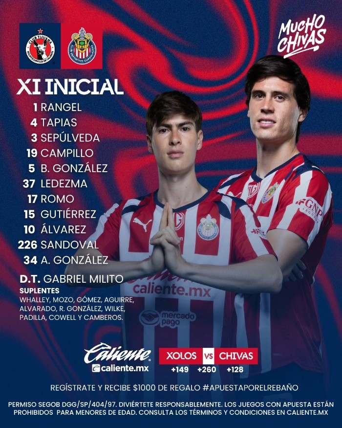 Deportes | Xolos vs Chivas • Momentos Destacados • Jornada 6 • Apertura 2025 Chivas visita a Tijuana con la misión de reencontrarse con el triunfo y sumar puntos tras las recientes derrotas en la Liga MX Moisés Figueroa 22 de agosto de 2025 - 22:11 hs XOLOS3 ‒ 3CHIVAS Termina el partido Xolos y Chivas empatan 3-3 en el partido correspondiente de la jornada 6. 90'+9 ¡Perdona Chivas! Armando González remata de cabeza, pero no le da dirección a portería. 90'+5 ¡Goooooooooooooooooooooooooooooooooooooool de Chivas! Alvarado recorta hacia dentro y saca un zurdazo cruzado de larga distancia para poner el balón en el ángulo y marcar un golazo. 90' Se agregan 10 minutos al segundo tiempo 83' ¡Goooooooooooooooooooooooooooooooooooooool de Chivas! Efraín Álvarez marca un golazo de tiro libre poniendo el balón en el ángulo. 73' ¡Goooooooooooooooooooooooooooooooooooooooooool de Chivas! Érick Gutiérrez pone un gran pase filtrado a Armando González quien define de buena manera tras la salida de Toño Rodríguez. Descontó el Rebaño, la "Hormiga" González acerca a los rojiblancos en el marcador. @Xolos 3-1 @Chivas pic.twitter.com/d0WrADFasb — FOX (@somos_FOX) August 23, 2025 64' ¡Goooooooooooooooooooooooooooooooooooool de Tijuana! Castañeda saca un disparo con poco ángulo que pega en el travesaño y Mora aprovecha el rebote dentro del área para marcar el tercero. La noche es de Morita, doblete de #GilMora que pone arriba a los locales. ⚽@Xolos 3-0 @Chivas pic.twitter.com/sBMsd8L9iN — FOX (@somos_FOX) August 23, 2025 50' ¡Goooooooooooooooooooooooooooooooooooooool de Xolos! Boya queda solo dentro del área y manda el balón a las redes. 48' Avisa el Rebaño Cowell saca un disparo potente y pasa muy cerca de la portería que defiende Toño Rodríguez. 45' Cambios de Chivas Salen: Campillo, Tapias y Mozo. Entran: Alvarado, Aguirre y Cowell. Inicia el segundo tiempo Arranca la parte complementaria en el Estadio Caliente. Termina el primer tiempo Xolos se va al descanso con el marcador a su favor ante unas Chivas que no encuentran el gol. 45'+4 ¡Rangel detiene el penal! Preciado tira el penal con poca colocación y Raúl Rangel detiene el balón con las piernas. ¡ATAJADÓN DEL TALA! �� El "Tala" Rangel le dice que no a Tijuana, el portero rojiblanco le da vida al Rebaño. ��@Xolos 1-0 @Chivas pic.twitter.com/uQu0SmCTvU — FOX (@somos_FOX) August 23, 2025 45'+1 ¡Penal para Tijuana! En un tiro libre, Campillo le jala la camiseta a Frank Boya quien cae y se marca penal tras la revisión del VAR. ��¡PENAL PARA LOS XOLOS! �� El Xolaje tendrá la oportunidad de aumentar el marcador antes del descanso. @Xolos 1-0 @Chivas pic.twitter.com/EdTeamOkvM — FOX (@somos_FOX) August 23, 2025 90' Se agregan 6 minutos al primer tiempo 36' ¡Cerca Chivas! Armando González deja el balón de tacón para Efraín Álvarez que saca un disparo cruzado y el balón pasa rozando el poste. 26' ¡Perdona Tijuana! Frank Boya manda un centro raso a Castañeda quien remata dentro del área, pero el balón sale desviado. 11' Responde Chivas Érick Gutiérrez se anima con un disparo en los linderos del área, pero el balón se va desviado. 7' ¡Polémica en el juego! Preciado es derribado por Mozo dentro del área, pero la central decide no marcar falta. 4' ¡Gooooooooooooooooooooooooooooooooooool de Xolos! Mora remata cruzado dentro del área grande tras el error en la marca de la defensa rojiblanca y vence a Rangel. ¡A Gil Morita no le puedes dejar una, porque no la va a fallar!�� Tijuas, aquí les dejo el gol con el que sus @Xolos abrieron el marcador ante el Rebaño.��❤️#LaLigaDeLaAfición✨ | #J6 | #AP25 pic.twitter.com/UwPbteIx2E — Liga BBVA MX (@LigaBBVAMX) August 23, 2025 3' ¡Malas noticias para Chivas! Ledezma se tira al césped tras sentir una molestia en la pierna derecha y sale lesionado. En su lugar entra Mozo. Inicia el partido La central Katía García hace sonar su silbato y comienza el partido en el Estadio Caliente. Alineación de Chivas Este es el once que manda Milito: Temas Chivas Xolos de Tijuana Liga MX Futbol Mexicano Apertura 2025 Lee También VIDEO | Así fue la caída de una grúa en construcción del viaducto elevado en Tijuana Mundial 2026: cuándo es y dónde ver el sorteo que será en Washington Aguirre arma un Tricolor "doméstico" para microciclo Jalisciense gana oro en natación artística en Asunción 2025
