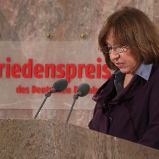 Su discurso estuvo precedido por el mensaje laudatorio del historiador Karl Schlögel, quien calificó a la galardonada, de 65 años, de "arqueóloga del mundo comunista" por sus cuatro décadas dedicada a retratar la órbita de lo que fue el bloque soviético y sus secuelas.