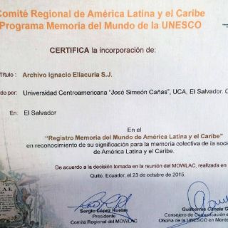 El documento que certifica la declaración fue entregado por el delegado del Comité Regional para América Latina y el Caribe del programa Memoria del Mundo de la UNESCO y director del MUPI, Carlos Henríquez Consalvi, al rector de la jesuita Universidad Centroamericana (UCA), Andreu Oliva.
