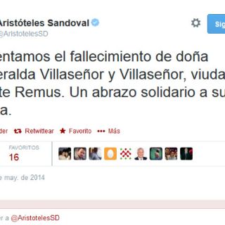 A través de su cuenta de Twitter ( @AristotelesSD), el gobernador Aristóteles Sandoval confirmó la noticia, al tiempo que envió sus condolencias a la familia.
