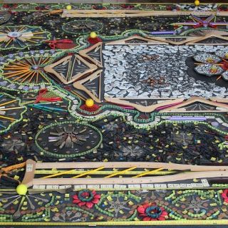 Todo un tapiz, rebosante de intensos colores, es lo que confeccionó el colombiano Federico Uribe a partir de centavos, llaves, cucharas de plata, fichas de dominó o muletas pertenecientes a los moradores de la casa, presidida por un retrato del artífice de esta residencia hecho con cables, "porque era un hombre muy conectado política y económicamente", explicó Dinapoli.