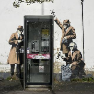 El mural, que apareció un domingo por la mañana, muestra a unos hombres vestidos con gabardinas y gafas oscuras junto a una cabina de teléfono con unos artilugios para escuchar conversaciones.