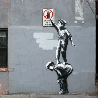 La primera pieza, de un niño montado sobre otro con el fin de tomar la lata de spray de un anuncio en que se lee "El grafiti es un crimen", fue detectada el martes cerca del Barrio chino.