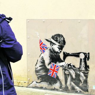 El grafiti, pintado en la pared de un bazar, representa a un niño de origen asiático, sin zapatos y con ropa desgastada, trabajando ante una máquina de coser en la confección de una decena de banderas del Reino Unido, que estos días decoran las calles londinenses con motivo de los sesenta años en el trono —jubileo de diamantes— de Isabel II.