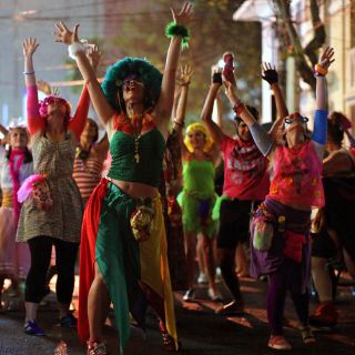 La marea humana avanza entre pasos de danza, saltos y carruseles en un derroche de alegría, irreverencia y fantasía con disfraces, máscaras y pelucas coloridas que sobresalen entre los paraguas abiertos por algunos para protegerse de la lluvia que esporádicamente cae sobre el gentío.