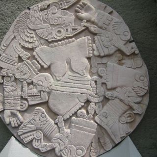 La pieza —de 3.25 metros de diámetro— muestra a la diosa Coyolxauhqui decapitada y mutilada de brazos y piernas, luego del combate que sostuvo con su hermano Huitzilopochtli, deidad solar y de la guerra, según refiere el mito narrado por los cronistas Bernardino de Sahagún y Diego Durán.