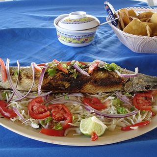 También está el robalo a la tabasqueña. Este pescado se rellena con calamar, pulpo y camarón y se sazona con jugo de naranja, antes de ser llevado al horno. Se sirve sobre olorosas hojas de chaya, arroz blanco y plátano verde.