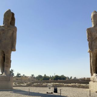 Los Colosos de Memnón, de 21 metros de altura, representan al faraón sentado con las manos sobre sus rodillas. Miles de turistas acuden cada año a Luxor para visitar estas estatuas.