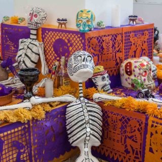 La pieza central de los festejos es una colorida ofrenda con calaveras, catrinas, una china poblana, flores de cempasúchil de tela, veladoras, pan, fruta y dulces, que fue donada por el gobierno del Estado de Puebla.