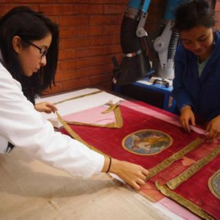 La restauración de la pieza, que presentaba deterioro en su estructura de metal, pérdida del elemento piloso del terciopelo y rotura de hilos de algodón de la entretela, está a cargo del Seminario Taller de Restauración de Textiles de la Escuela Nacional de Conservación, Restauración y Museografía (ENCRyM).